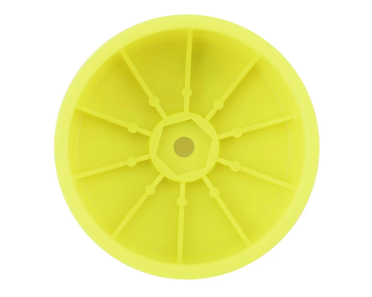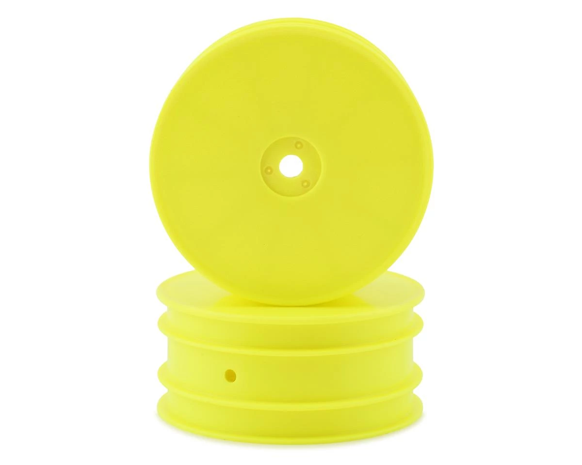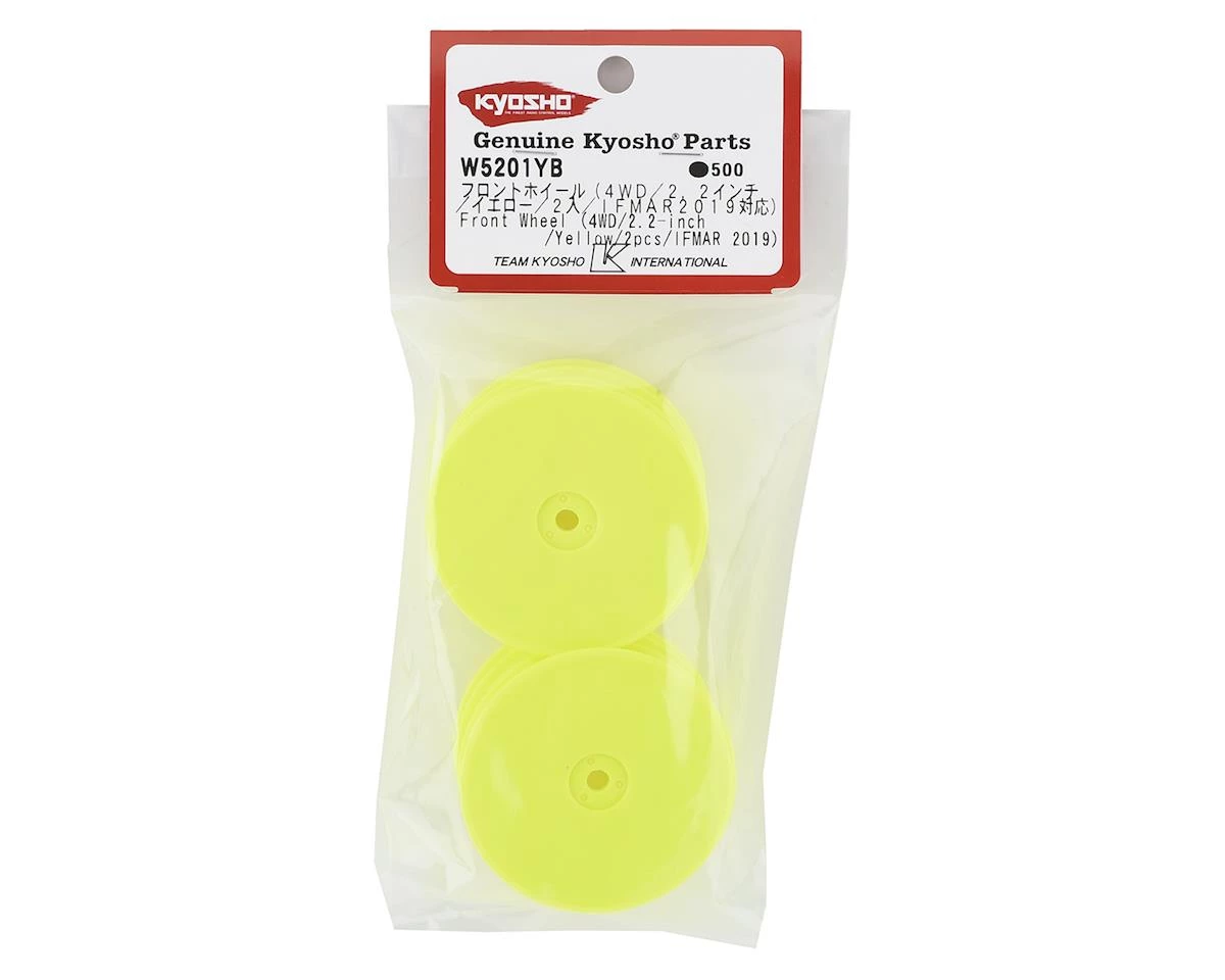 This is a set of Kyosho Yellow 12mm Hex 2.2″ 4WD Front Wheels, intended for use with Lazer Kits.Â
