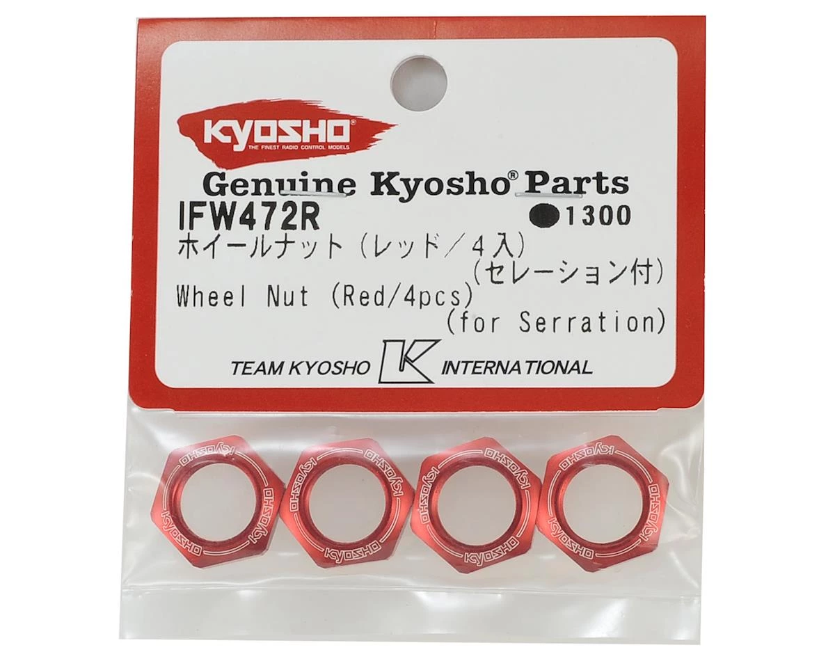 This is a pack of four replacement Kyosho 17mm 1/8 Serrated Wheel Nuts in Red Anodize.Â