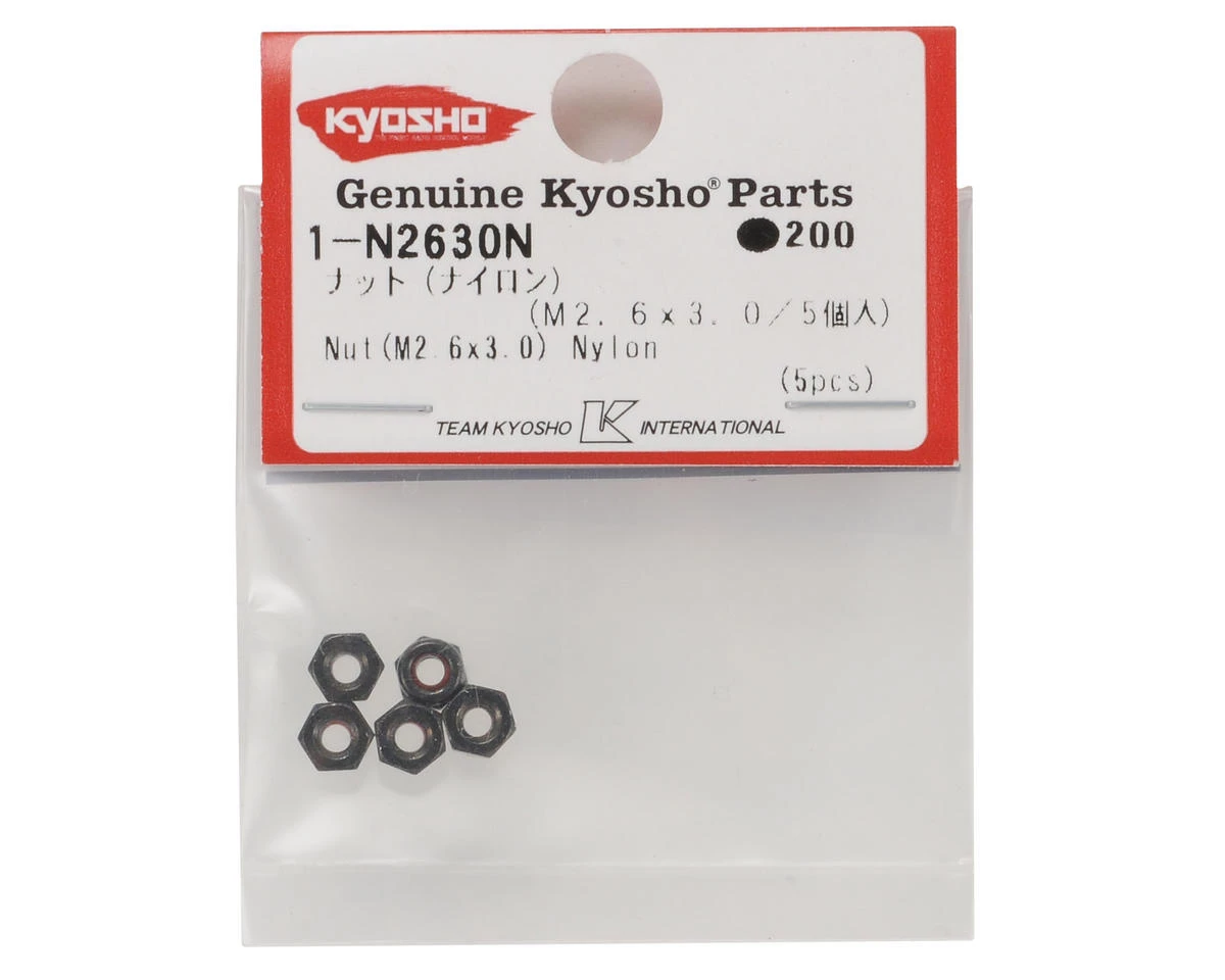 This is a pack of five Kyosho 2.6×3.0mm Steel Nylon Nuts.Â