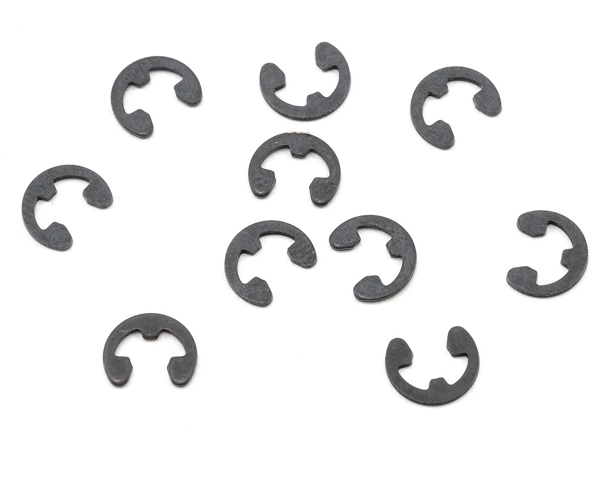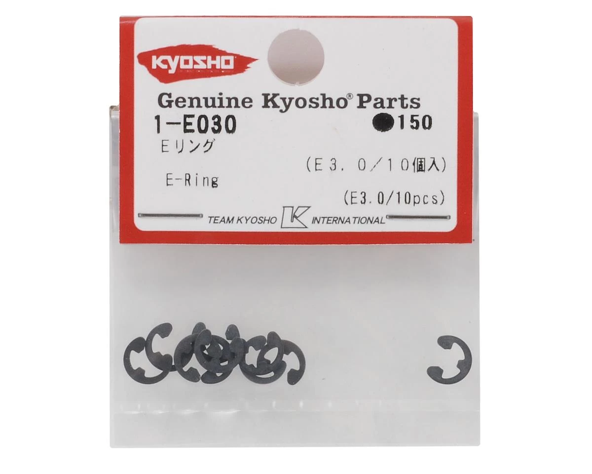 This is a set of ten Kyosho 3.0mm E-Clips. These E-Clips are used on Kyosho Inferno 1/8 scale vehicles, but are also an excellent choice for any application that requires a 3.0mm E-Clip. It is recommended that these parts be replaced after they have been removed and replaced 2 or 3 times to ensure that the clips remain tight.Â