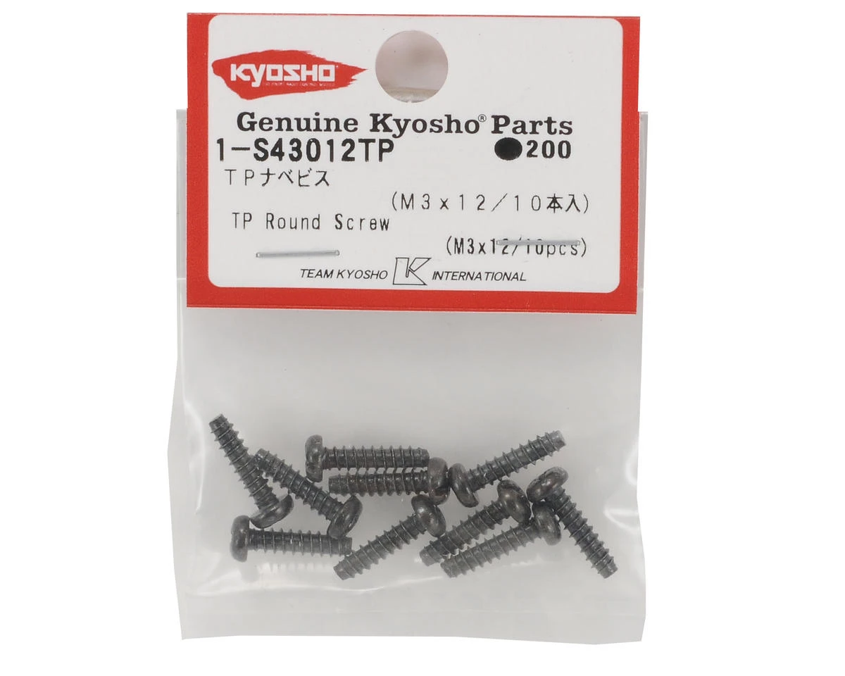This is a pack of ten Kyosho 3x12mm Self Tapping Round Head Screws. These areanexcellent choice for any application that requires a 3x12mm Self Tapping Round Head Screw.Â