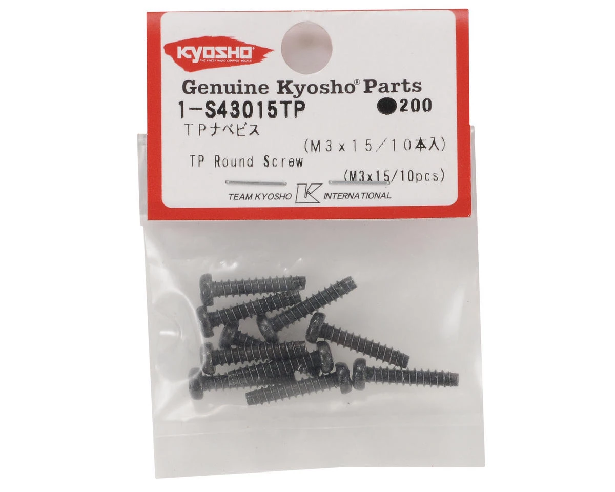 This is a set of ten replacement Kyosho 3x15mm Self Tapping Round Head Screws. These are an excellent choice for any application that requires a 3x15mm Self Tapping Round Head Screw.