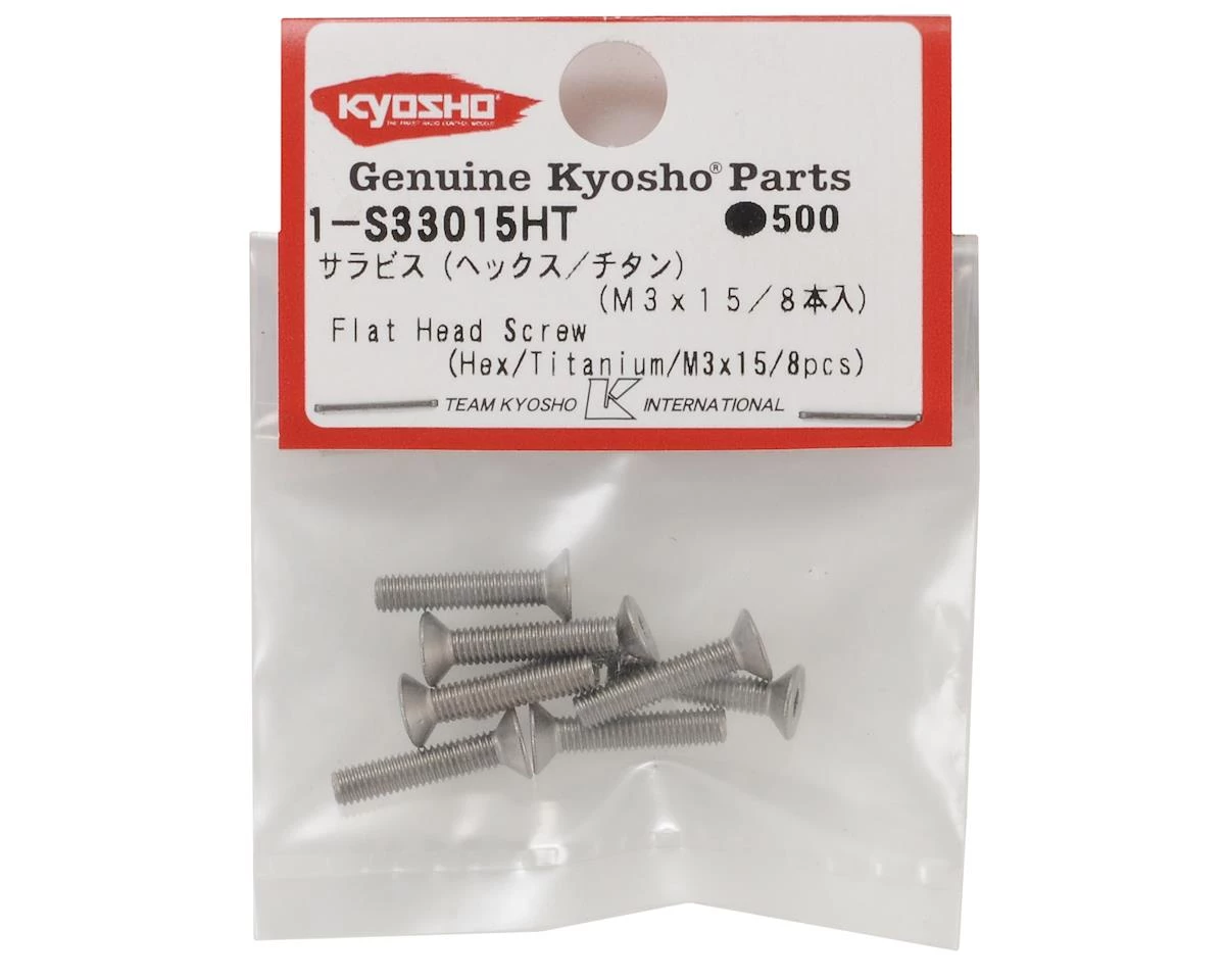This is a pack of eight replacement Kyosho 3x15mm Titanium Flat Head Hex Screws.