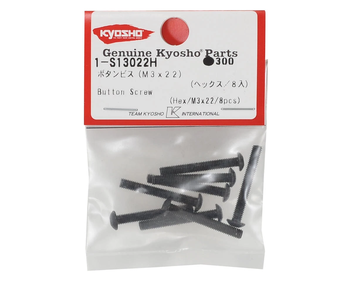 This is a pack of eight replacement Kyosho 3x22mm Button Head Hex Screws.Â