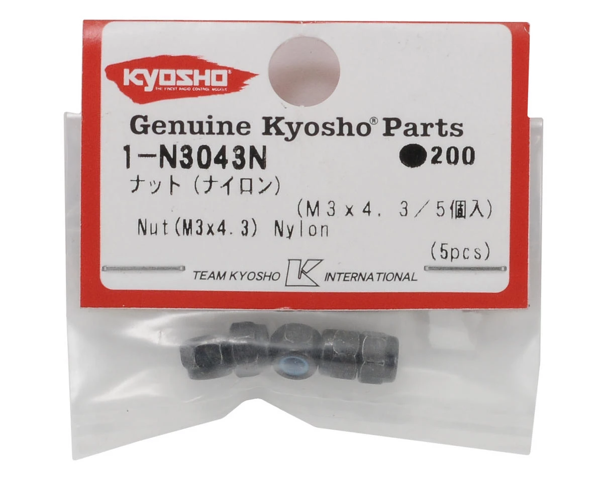 This is a pack of five replacement Kyosho 3×4.3mm Nylon Lock Nuts.Â
