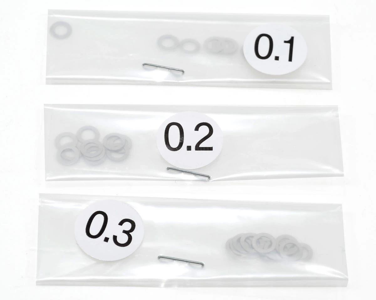 These shims are used to shim the clutch shoes on a Kyosho 3-shoe clutch, but can be used on any clutch that uses 3mm flywheel pins. They are installed on the flywheel pins before the clutch shoes are installed, and are used to space the clutch shoe off the flywheel. This will help to prevent the shoes from hanging up on the flywheel when the shoes pivot on the flywheel pins. These are also used on the Ultima and Lazer family of vehicles to remove excess play in the suspension arms, and are also used in the servo saver assemblies.Â