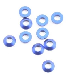 This is a set of ten replacement 3x6mm blue aluminum tapered washers for Kyosho buggies, and fits the Inferno MP7.5 and Inferno MP777 family of buggies. These are the small tapered washers that are used on the bottom of the steering ackerman plate to attach the steering linkages between the steering ackerman plate and the steering knuckles.