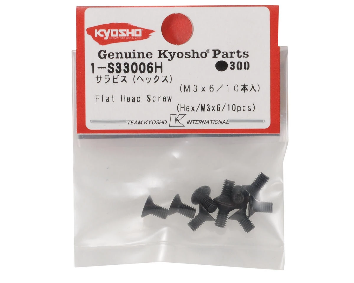 This is a set of ten replacement Kyosho 3x6mm Flat Head Screws. These are an excellent choice for any application that requires a 3x6mm Flat Head Screw.