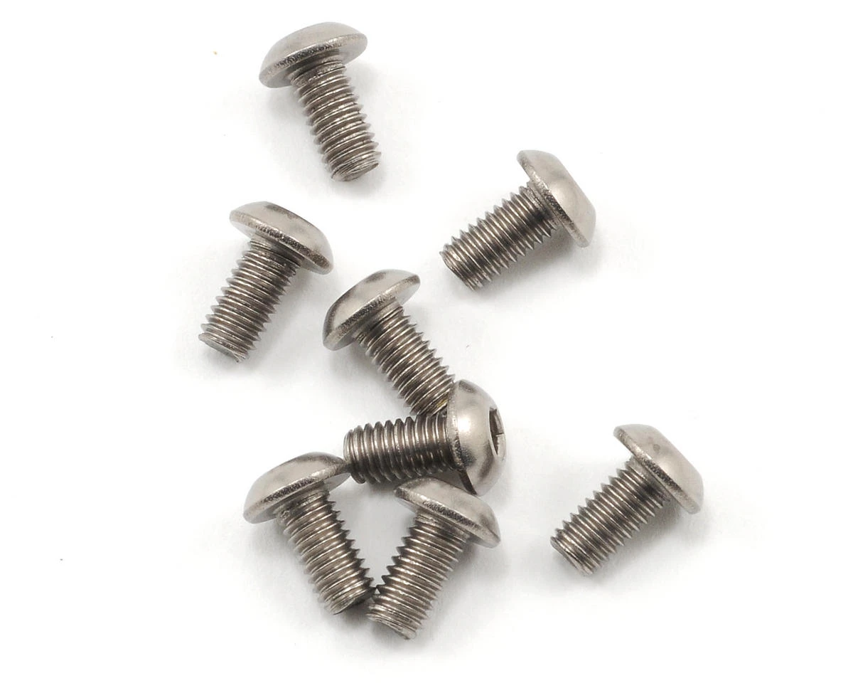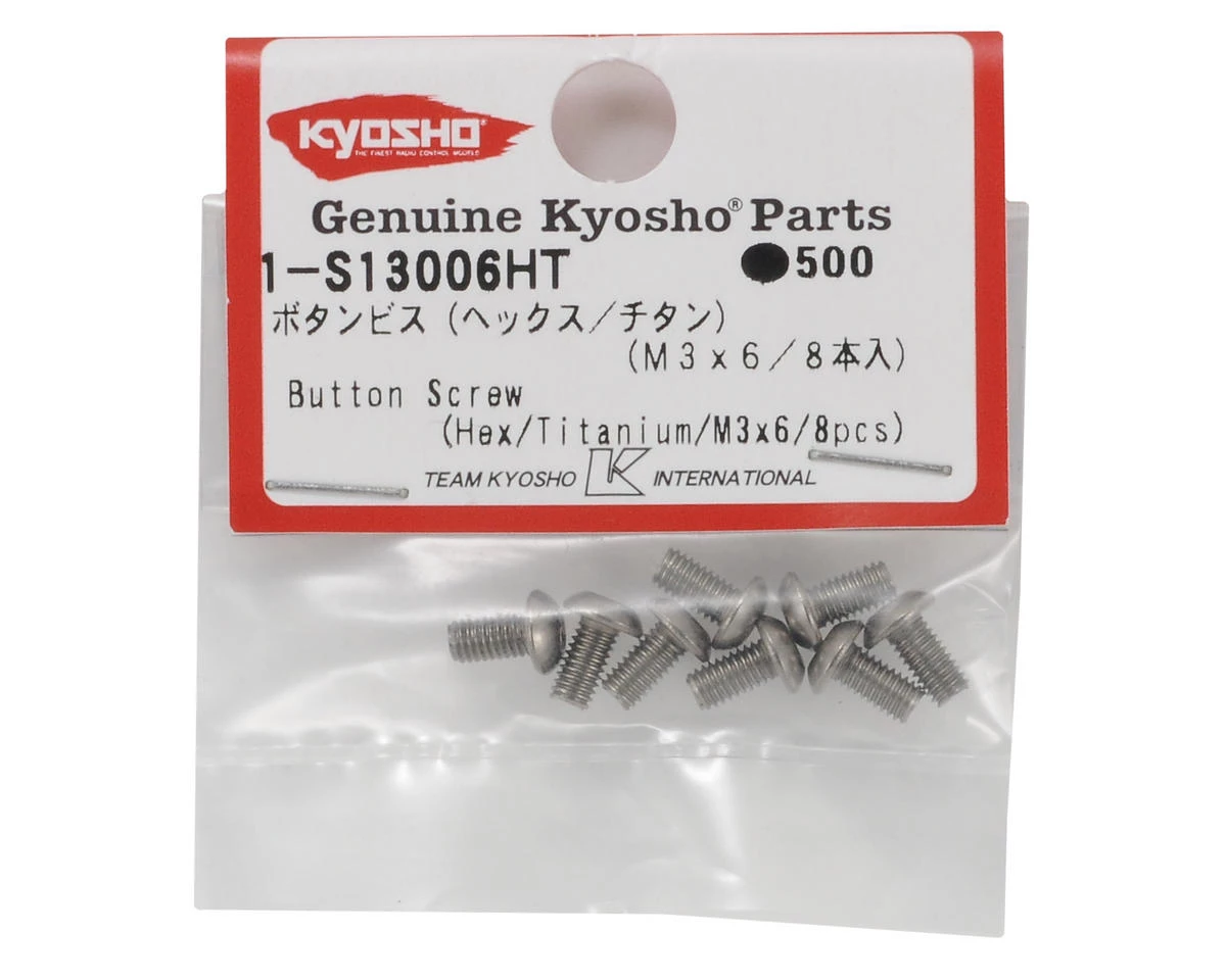 This is a pack of eight Kyosho 3x6mm Titanium Button Head Hex Screws. These screws are intended for use with Kyosho vehicles, but are an excellent option to remove weight in any application that requires a 3x6mm button head screw.Â
