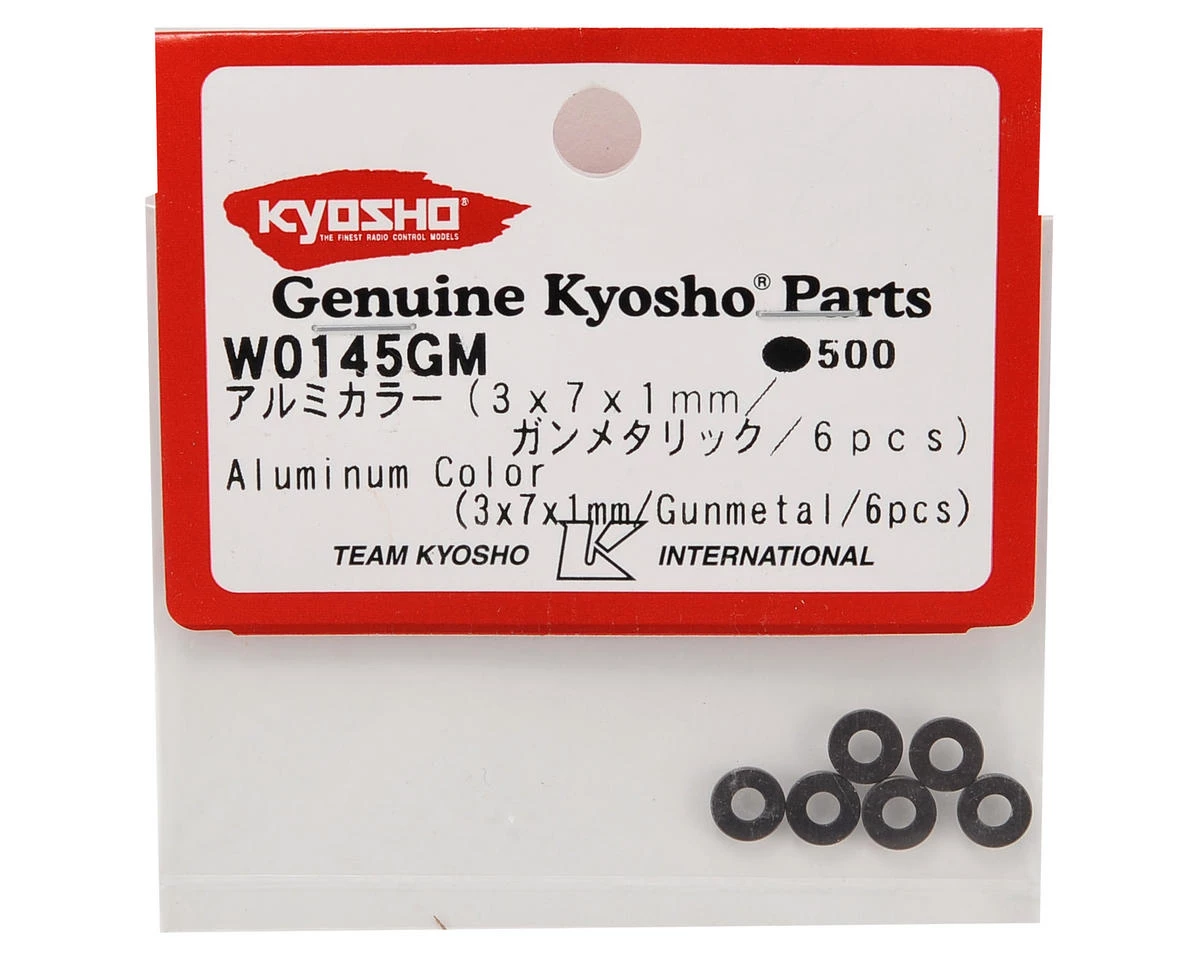 This is a pack of six optional Kyosho 3x7x1mm Aluminum Washers. These gunmetal anodized aluminum washers replace the plastic washers included with the kit. Â