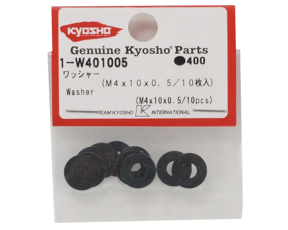 This is a pack of ten replacement Kyosho 4x10x0.5mm Washers.