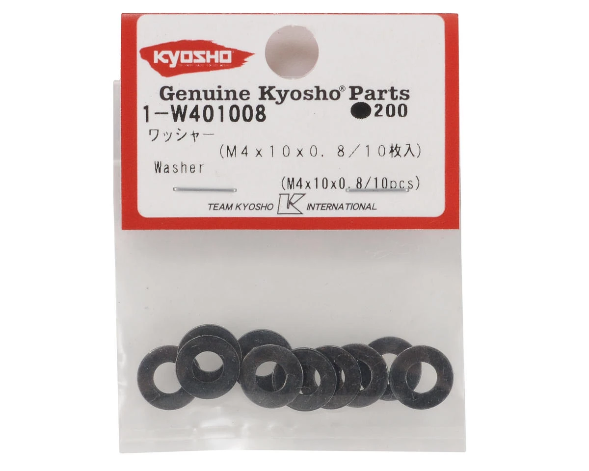This is a set of ten replacement Kyosho 4x10x0.8mm Washers. These are an excellent choice for any application that requires a 4x10x0.8mm Washer.
