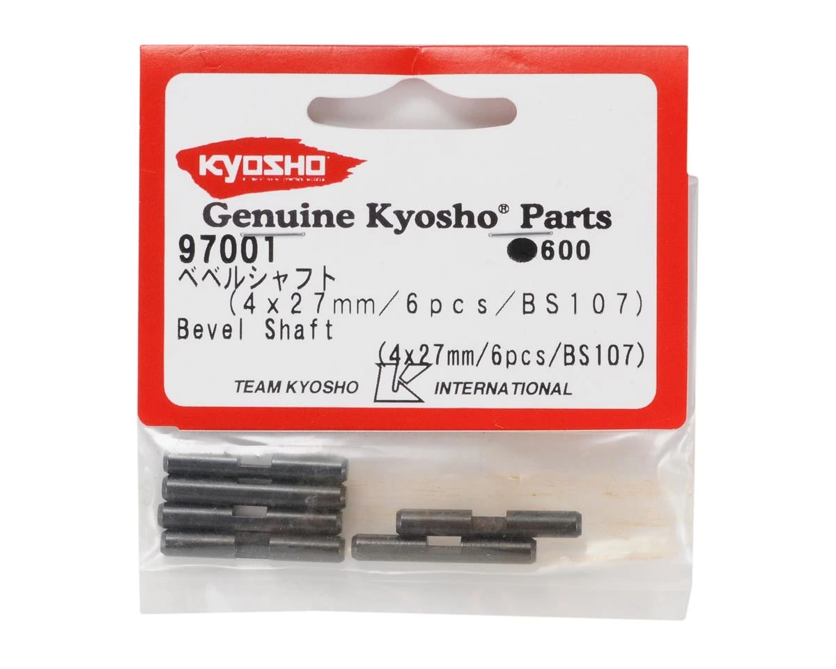 This is a set of six Kyosho 4x27mm Differential Gear Bevel Shafts intended for use with all Kyosho Inferno Series Buggies, Trucks and On Road Cars. These shafts are made of hardened steel and painted black. This part is a direct replacement/upgrade for Kyosho part number KYOBS107, that is used in all Inferno Series vehicles.