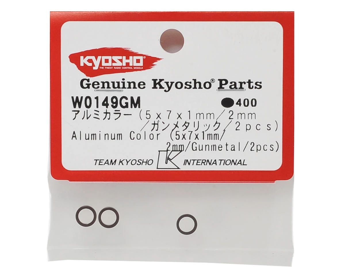 This is a pack of four Kyosho 5x7mm Aluminum Collars. These gunmetal anodized collars are used as spacers on a variety of Kyosho kits and have a 5mm inner diameter, with a 7mm outer diameter. Package includes two 1mm thick collars and two 2mm thick collars.