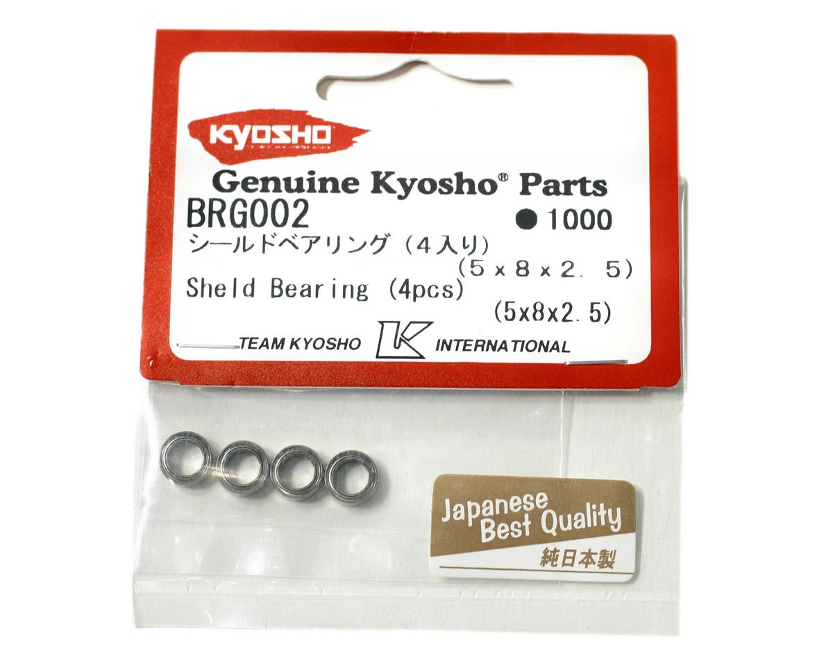 This is a pack of four replacement 5x8x2.5mm metal shielded ball bearings for Kyosho trucks and buggies. These are used for the servo saver steering posts on the Kyosho Lazer ZX-5 buggy.