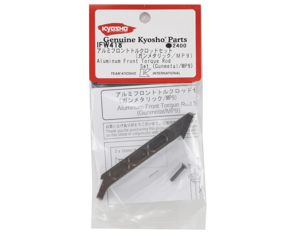 This is an optional Kyosho Aluminum Front Torque Rod, and is intended foruse with the Kyosho MP9. This upgrade part is a directreplacement for the stock chassis brace. CNC Machined from 7075 aluminumand Hard Anodized inKyosho’s unique gunmetal finish, this brace adds not only a cool factorylook, but can be used as a setup option to stiffen up the chassis onhigh grip surfaces.Â