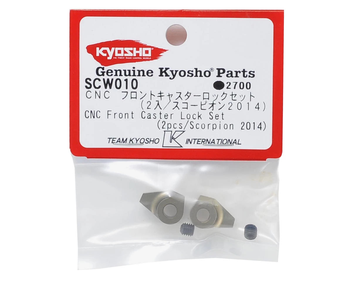 This is a pack of two optional Kyosho CNC Front Caster Locks. These locks are made from 6061 machined aluminum alloy material. Package also includes two set screws.