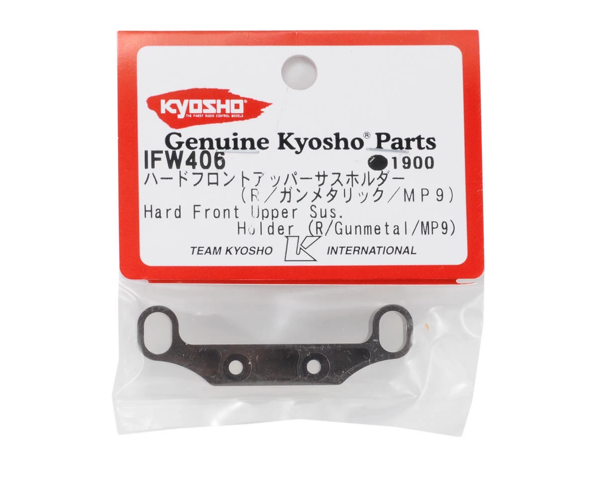 This is a optional Kyosho CNC 7075 Aluminum Front Upper Arm Holder, intended for use with the Kyosho MP9 1/8 buggy. This gunmetal anodized part uses the stock inserts for adjustment, and will increase strength and rigidity compared to the stock plastic part, while remaining as light as possible.