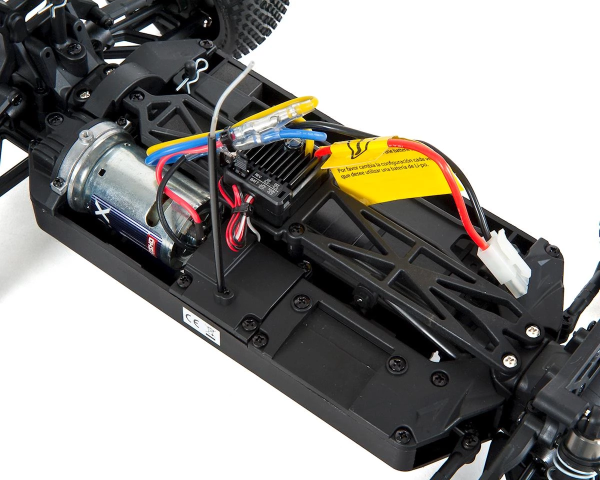 - Insert batteries (not included) into the transmitter; set the included battery on the fully assembled chassis, and the Readyset is GO!