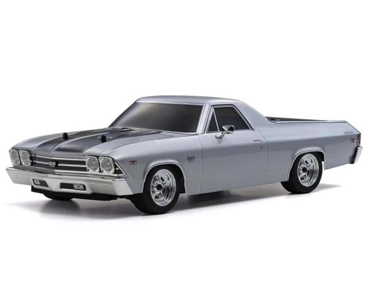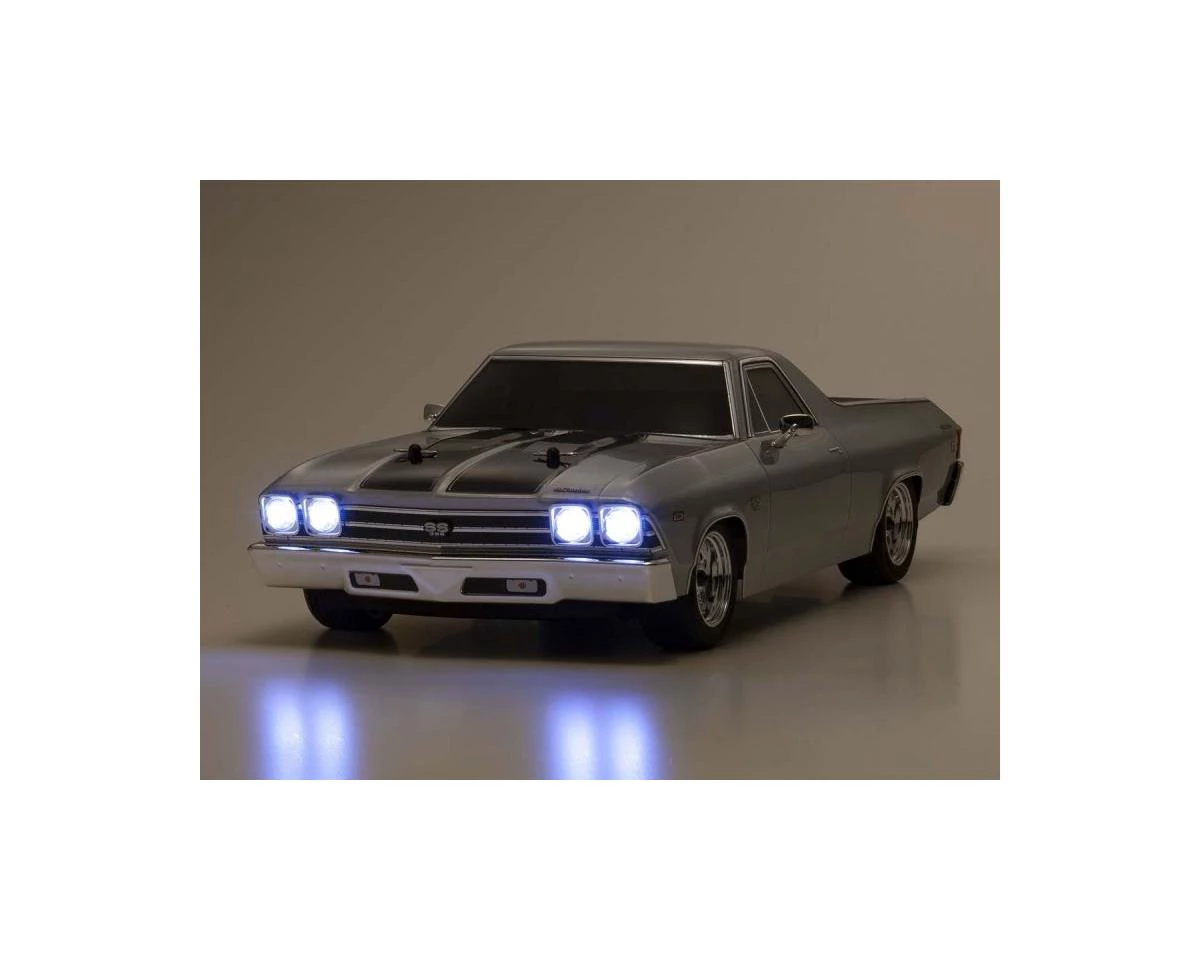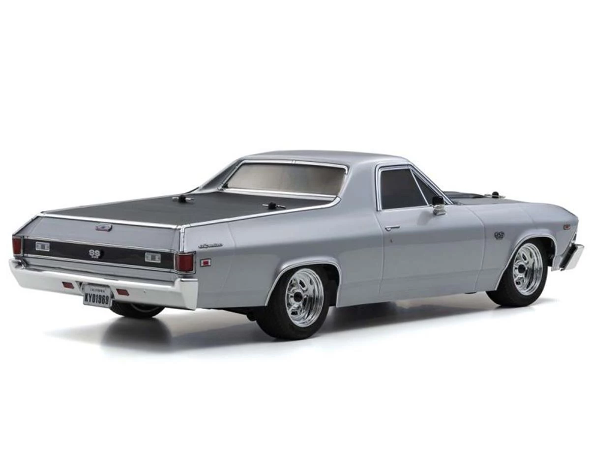 The Kyosho Fazer Mk2 FZ02L 1969 Chevy Chevy El Camino ReadySet takes the standard Fazer touring car chassis and combines it with the latest “Ultra Scale Body” to more accurately replicate the fine details of the full size car. A simplified design with fewer parts has improved maintenance efficiency and reduced weight while core strength and rigidity has been increased through new materials and ribbing and stiffeners on front and rear. In addition, the symmetrical chassis design synergizes excellent front-rear balance through the suspension with responsive control, irrespective of power source. Featuring slipper clutch, front & rear gear differentials, oil shocks and full ball bearing specs, the high durability and impact resistance allows drivers to unleash the full potential of the chassis. Brake disc wheel hubs with two different offsets (0mm, +5mm) provide compatibility with 190mm and 200mm width body styles and allows the wheelbase to be adjusted to 260mm by replacing some parts (sold separately) for compatibility with other 1/10 scale body styles, in addition to the body included. The Readyset package comes fully assembled and includes everything except charger and battery for the chassis, and batteries for the transmitter.