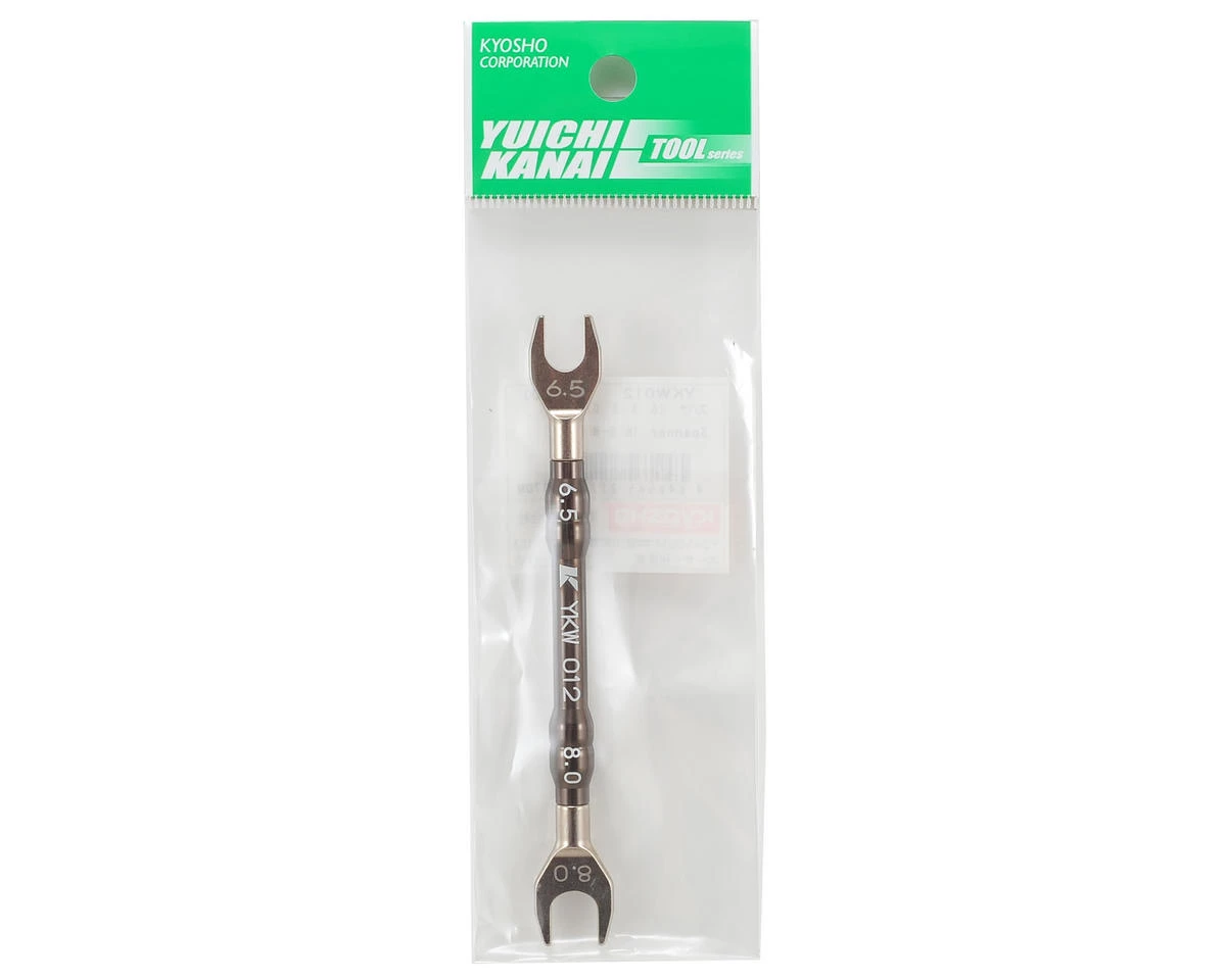 This is a Kyosho Kanai Tools Spanner Wrench, with 6.5mm and 8.0mm ends. This wrench was developed by Yuichi Kanai specifically for use with the Inferno MP9 series vehicles. The deep 8mm end allows easy installation/removal of the shock standoffs on the shock towers, while the 6.5mm end is perfect for easy ball end installation on the turnbuckles and rods.