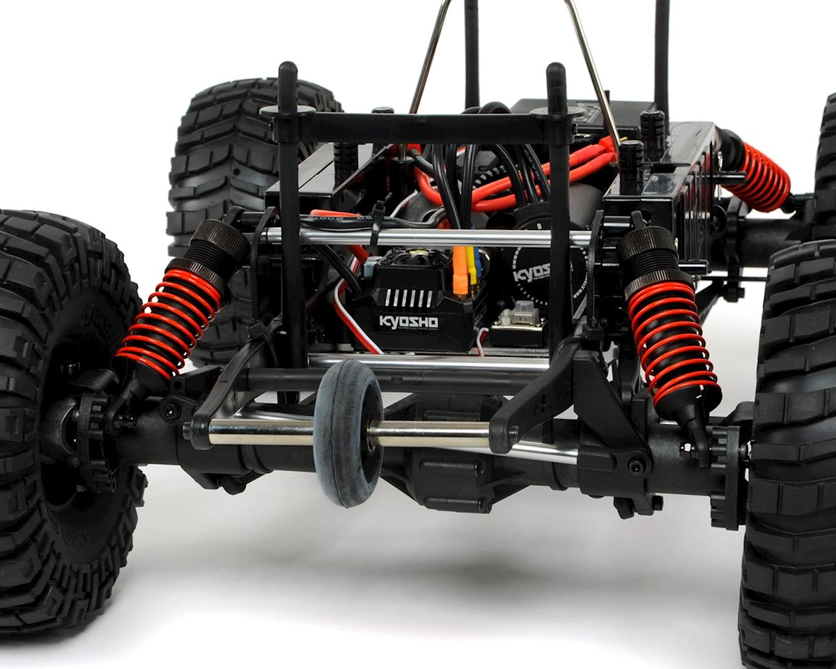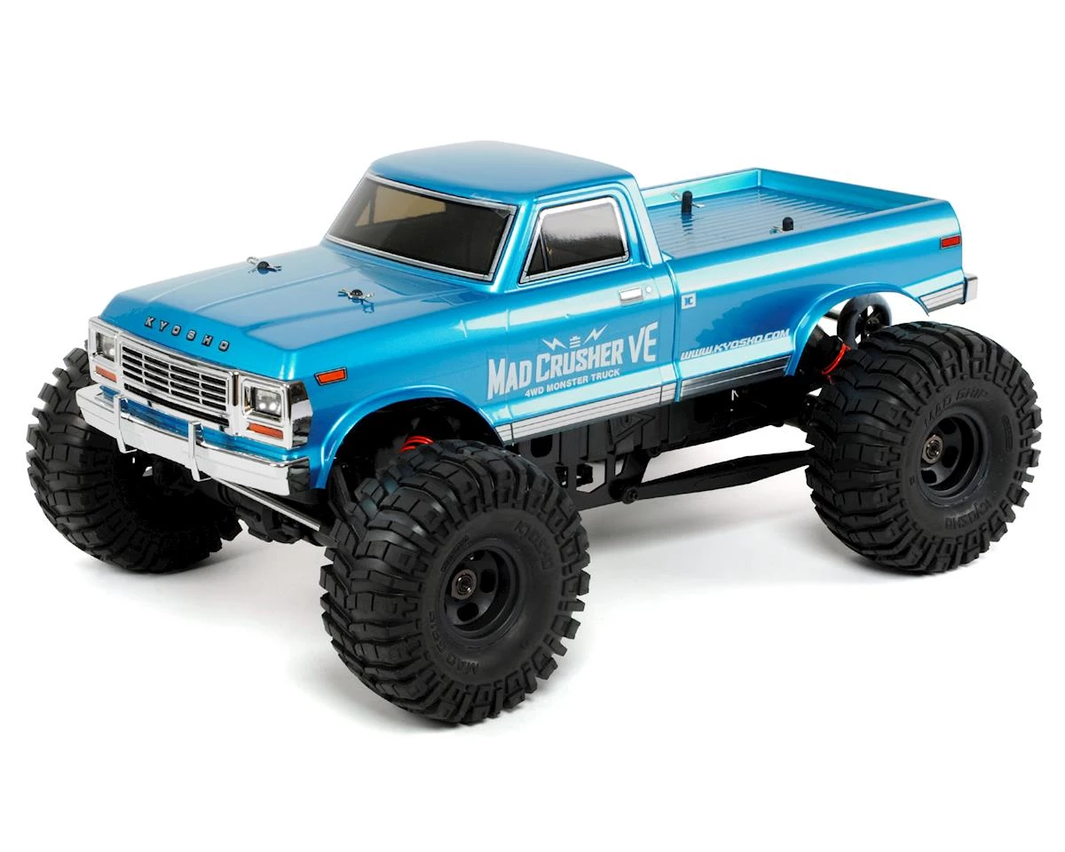 The Kyosho Mad Crusher VE 1/8 ReadySet 4WD Monster Truck, based on the heavy-duty Mad Force Cruiser chassis, showcases awesome 1970’s style, with chrome plated injection molded grill, bumper, wipers and mirrors and smoke colored transparent cab windows. Realistic scale wheels and massive 150mm x 70mm block-pattern tires tires will inspire you with its dominant presence. Included light buckets can be customized by purchasing a light kit.