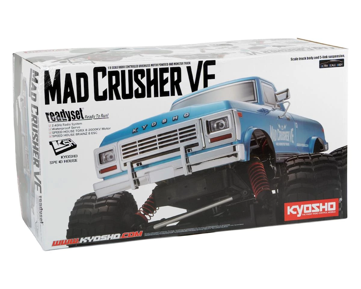 The MAD CRUSHER VE incorporates a redeveloped 5-link suspension system featuring ball joint upper and lower links in combination with lateral rods that deliver a deeper, supple stroke, more characteristic of rock crawlers. Equipped with the powerful 2000KV Kyosho Speed House Torx 8 brushless motor, you can drive over any surface from tarmac to off-road with ease. Simply add AA-size batteries for the transmitter and a battery for the chassis and the MAD CRUSHER VE Readyset will get you straight into monster trucking action!