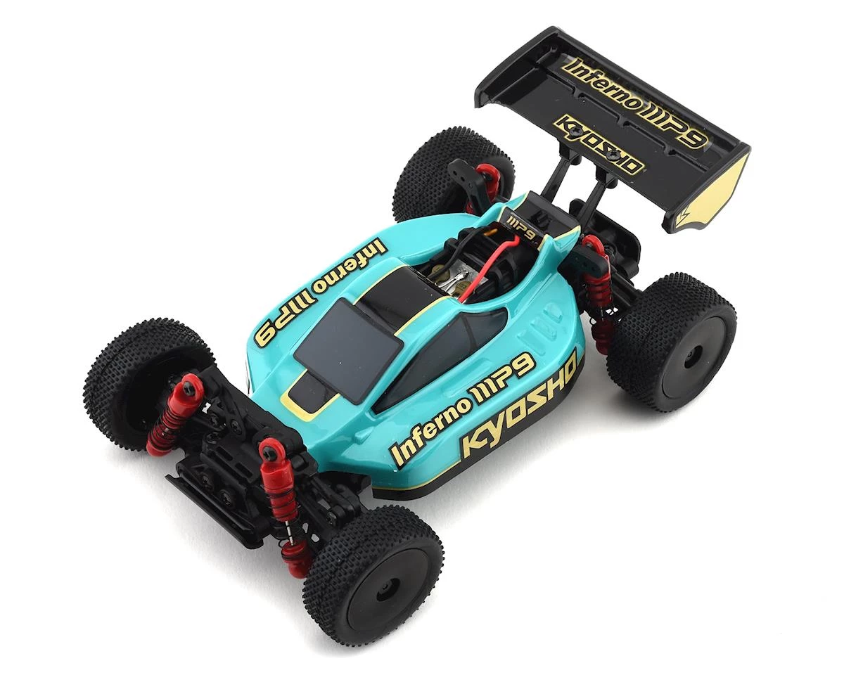 The Kyosho MB-010S Mini-Z Buggy Inferno MP9 TKI3 Readyset features a 4WD drive train supported by a 4-wheel independent double-wishbone suspension with oil shocks and a slipper clutch to protect the gears in a technologically advanced design that far exceeds any expectations of its palm top size.