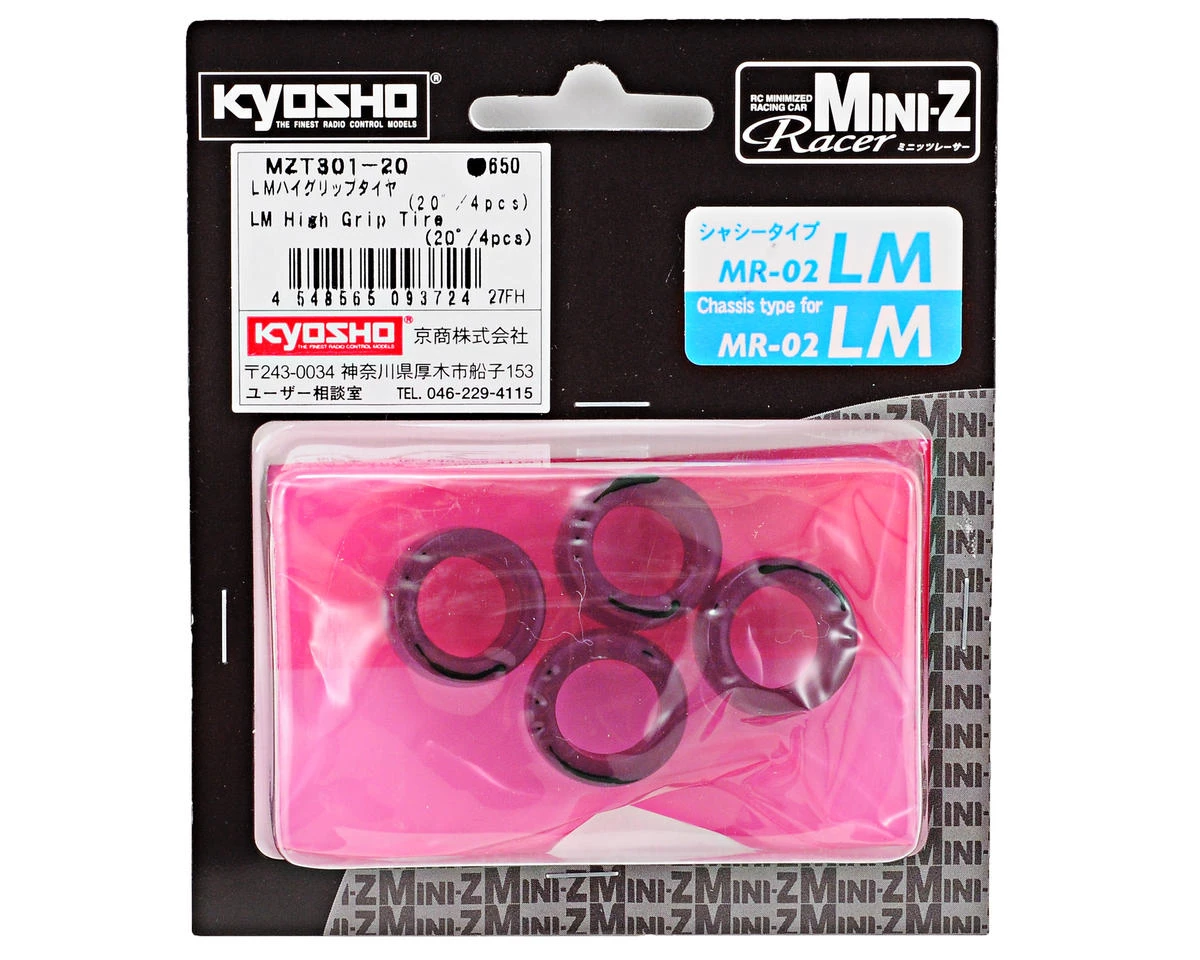 This is a set of four Kyosho High Grip Front Tires, for use with the Kyosho Mini-Z MR LM Type chassis. Choose from 20, 30 and 40 Shore compounds (softest to hardest). 40 Shore is the standard compound included with Mini-Z MR LM kits, with 20 and 30 being optional softer compounds. Use different compounds to tune the level of traction for various track conditions; softer when you need more grip and harder when you want less grip.