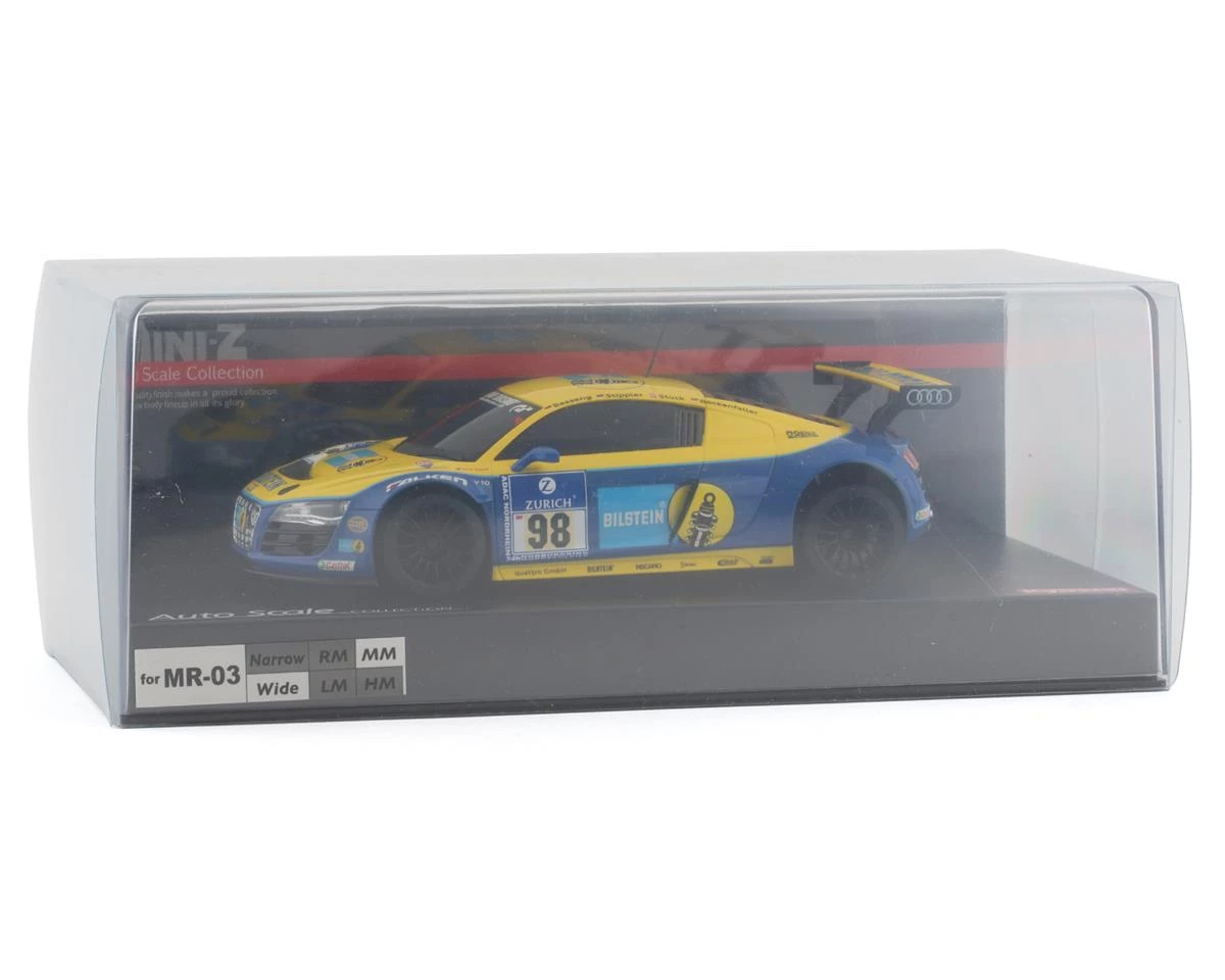 The Kyosho Mini-Z MR-03 RWD Audi R8 2010 LMS NBR No.98 Autoscale Body is a ready to install detailed body option for the MR-03W RWD platform chassis.. This body is equally suited to use as a display model, or to give your existing model a face lift. Package includes one pre-painted body and one display stand.
