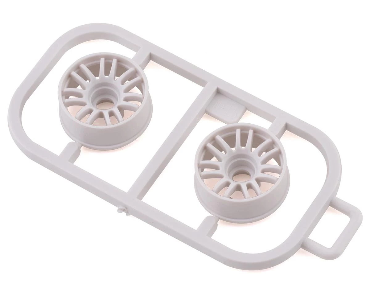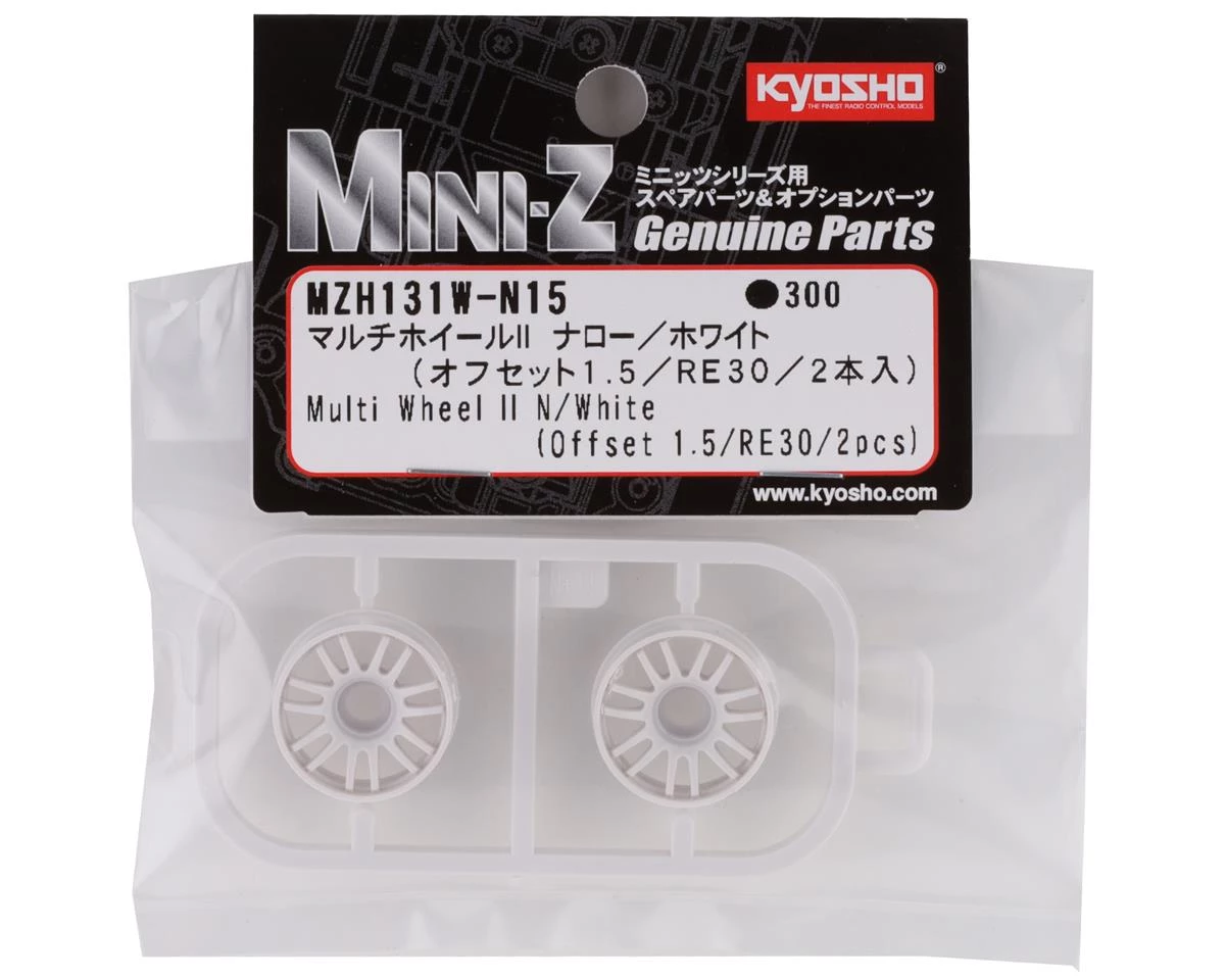 This is a optional set of two Kyosho Mini-Z Rays RE30 Multi Wheel II. These are the optional Narrow, +1.5 Offset Wheels, and are a great option for tuning Mini-Z models for improved handling, or to suit different bodies. Plus, the bright white plastic is perfect for adding a personalized touch with your preferred color paint.