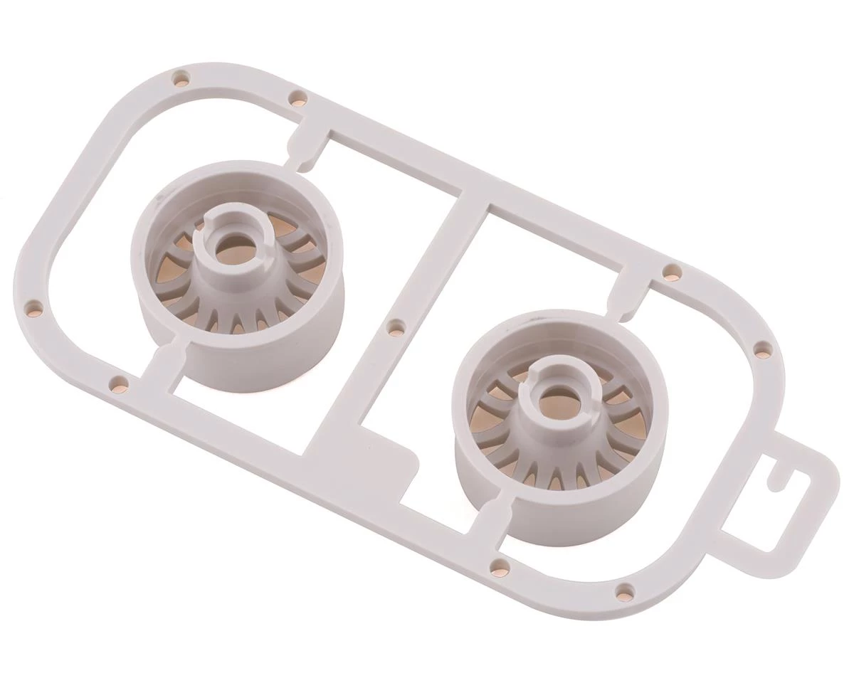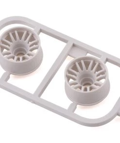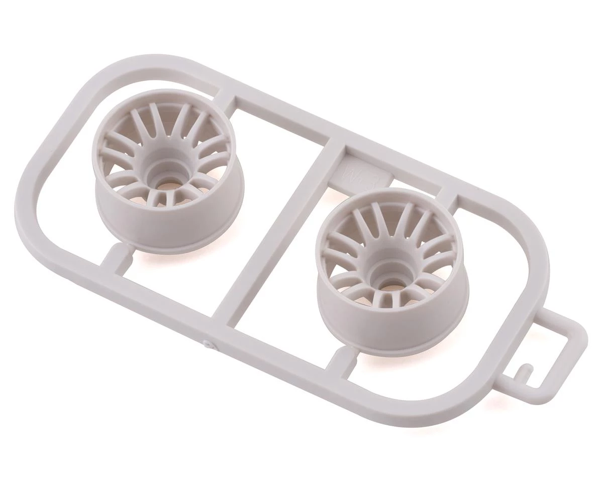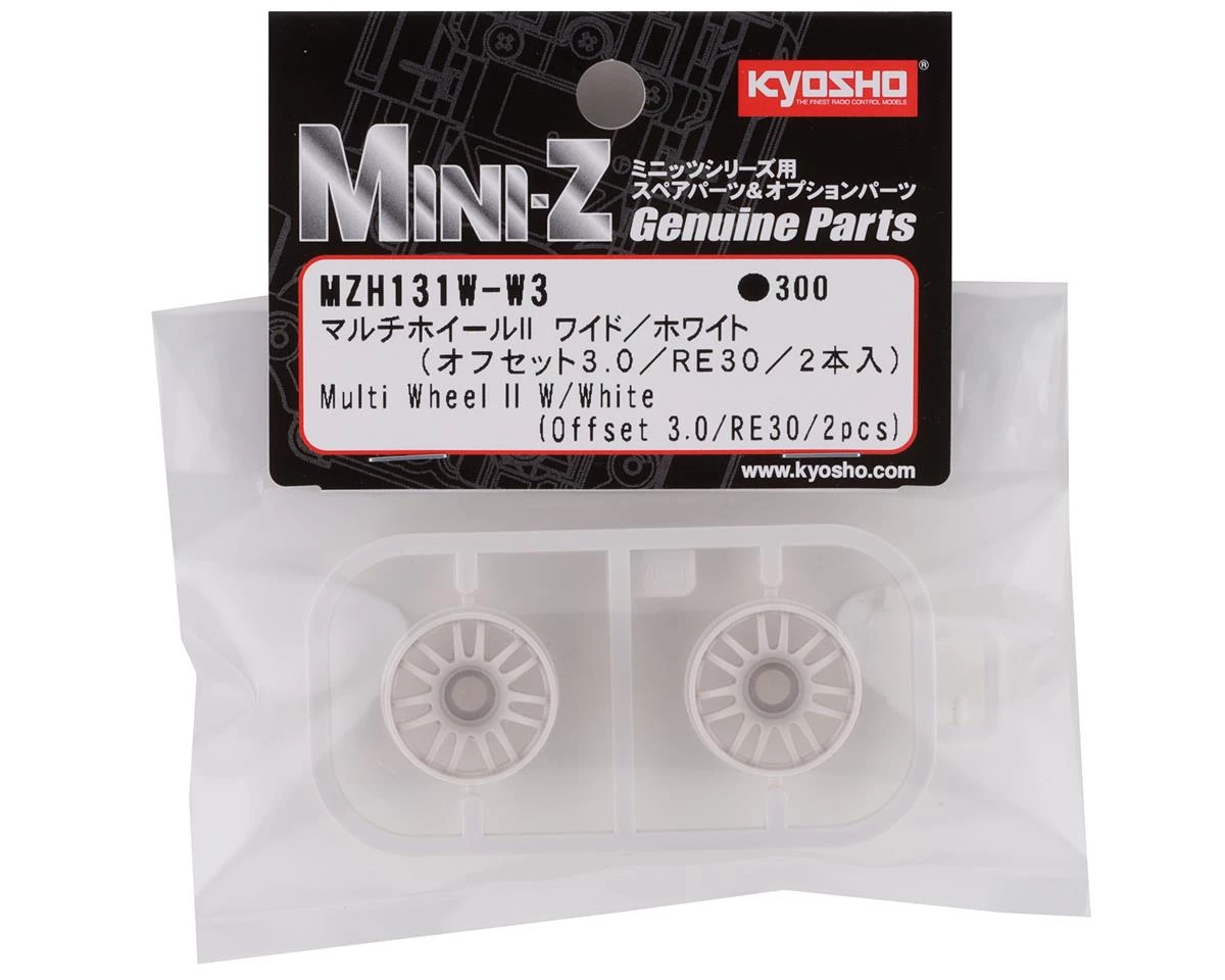 This is a optional set of two Kyosho Mini-Z Rays RE30 Multi Wheel II. These are the optional wide, +3.0 Offset Wheels, and are a great option for tuning Mini-Z models for improved handling, or to suit different bodies. Plus, the bright white plastic is perfect for adding a personalized touch with your prefered color paint.