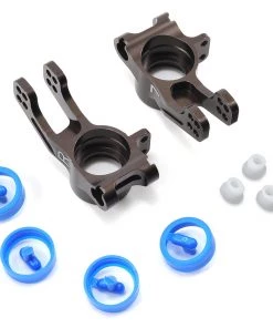 These are the replacement Kyosho Aluminum Aluminum Rear Hub Carriers included with the TKI4 buggy kit. These updated aluminum rear hubs feature eccentric inserts to increase the number of roll center options available. The upper linkage rod has an upper and lower mounting position, and the inserts on the rear hubs provides intermediate adjustments of just 1mm. This gives the racer four different settings to choose from instead of two.
