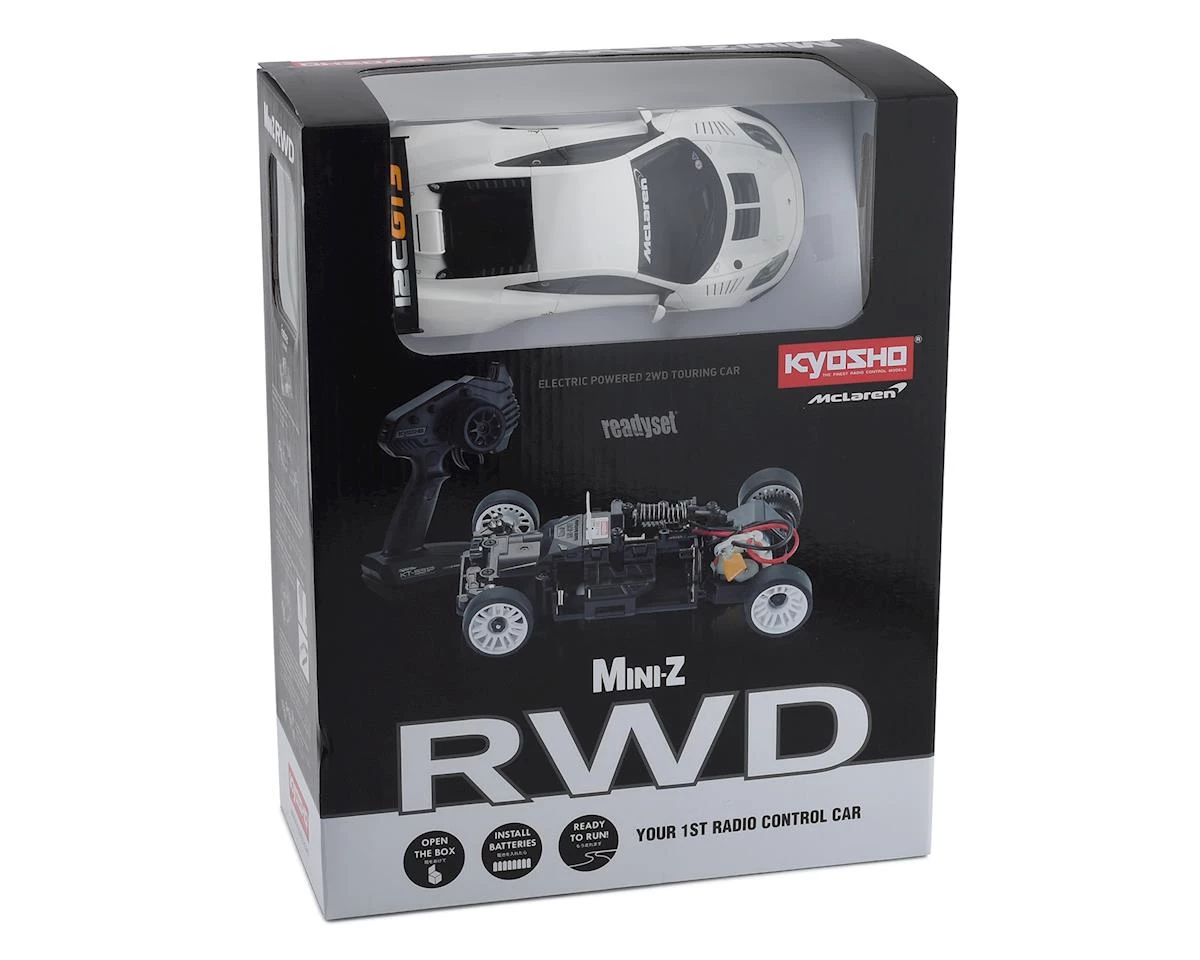 This is a Kyosho MR-03 Mini-Z RWD ReadySet with a McLaren 12C GT3 2013 Body and 2.4GHz Radio. With just eight AAA-size batteries, the MINI-Z Racer allows anyone to enjoy the action and advanced performance of R/C cars. First launched in 2013, Kyosho has renewed the MINI-Z Racer Sports MR-03 concept to be even more user-friendly and appealing to more drivers with the MINI-Z RWD series. Widely popular body styles in highly detailed body sets create the incredibly realistic model lineup.