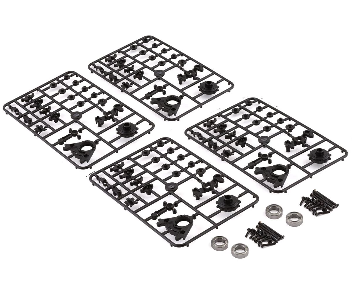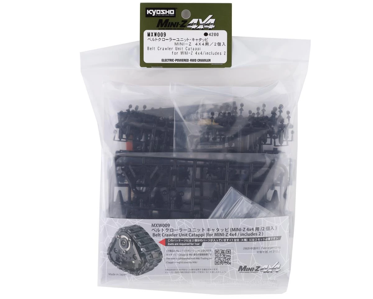 The Kyosho MX-01 “Catappi” Belt Crawler Unit, is a belt track conversion intended to replace standard tires on MX-01 kits to replicate a tough, track equipped rig for dramatically expanded performance in a variety of terrain. The belt has a full-scale structure that connects high-precision molded shoes with stainless steel pins. The belt itself does not stretch very much, preventing the belt from coming off while driving. In addition, the track type system improves the ability to overcome large steps and improve performance in rough terrain.