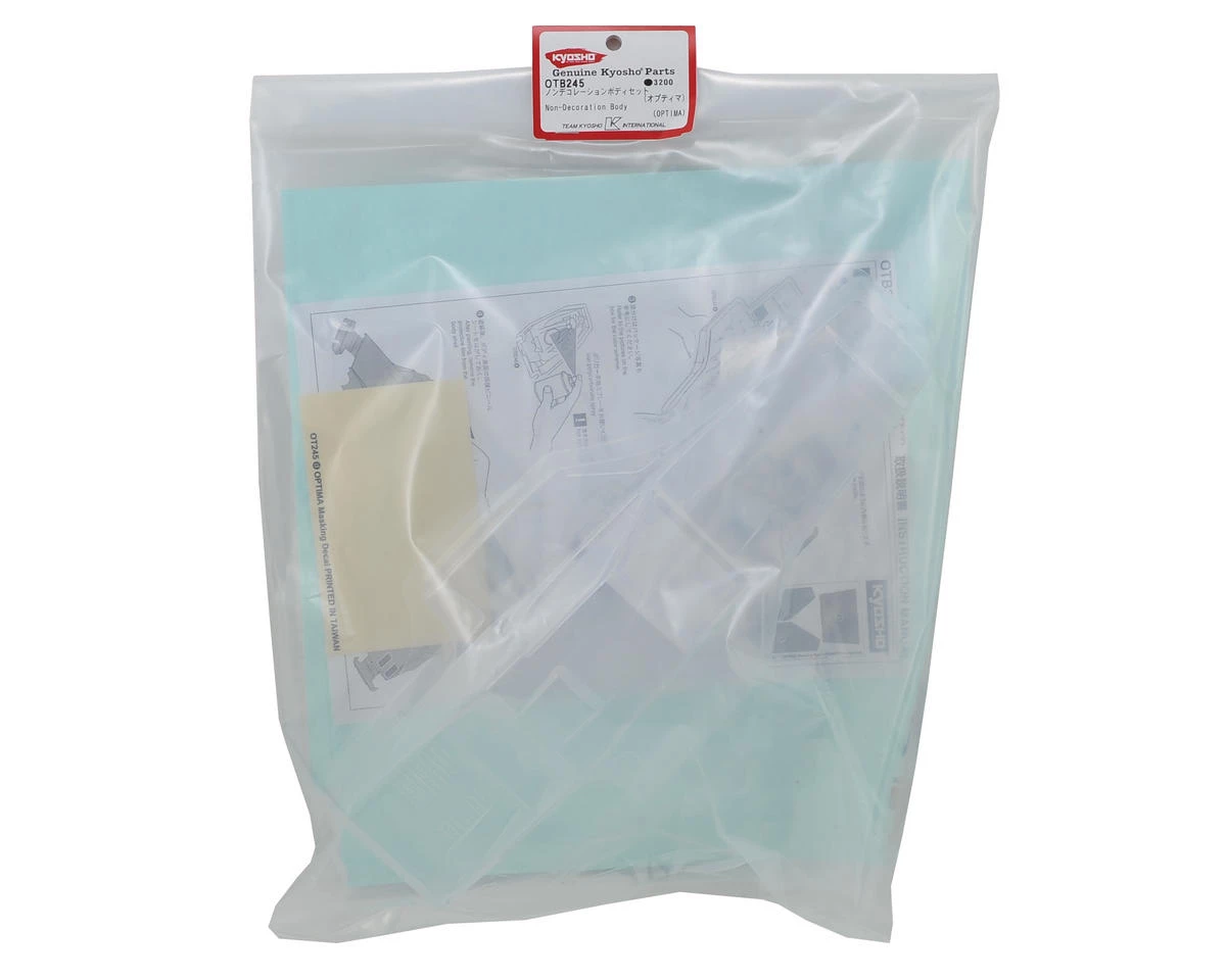 Kyosho Optima Body. Package includes clear body, window masks and decal sheet.