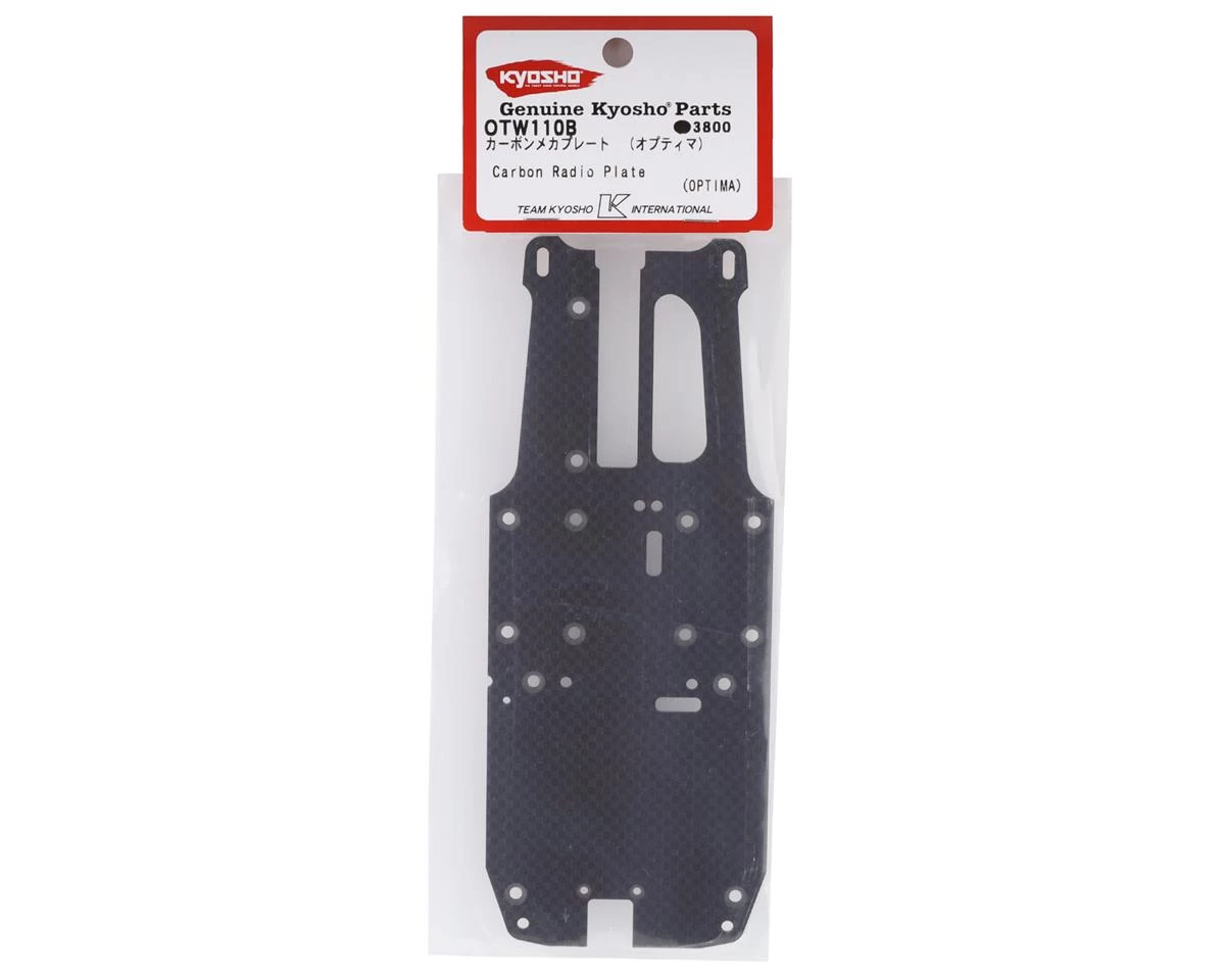 The Kyosho Optima Carbon Radio Plate is a carbon fiber option that provides increased stiffness, with a custom carbon fiber look.
