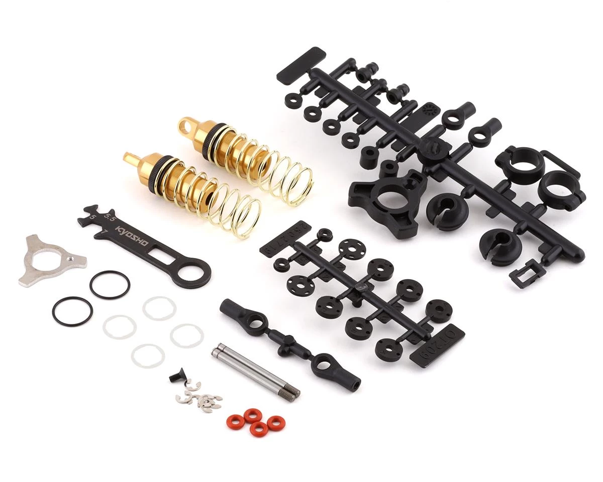 Kyosho Optima/Javelin Front Shock Set. Designed specifically for the Kyosho Optima or Javelin these optional shocks are a great way to add tuning and bling to the front of the car. With four different piston variations available and threaded shock bodies to make fine adjustments that will help your car handle like a dream. Package includes one complete shock set.Â