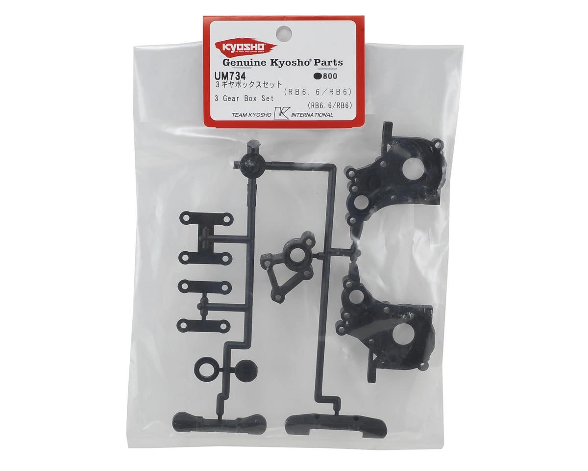 Kyosho RB6.6 3 Gear Box Set. Package includes replacement RB6.6 3 gear transmission case components.