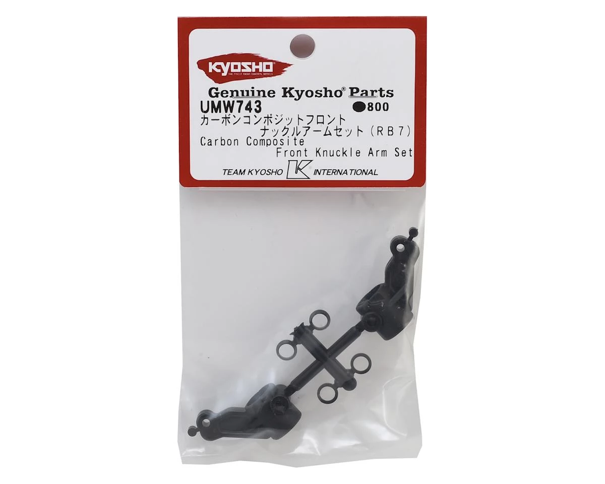 Kyosho RB7 Carbon Front Knuckle Arm Set. Package includes optional carbon front knuckles and spacers.