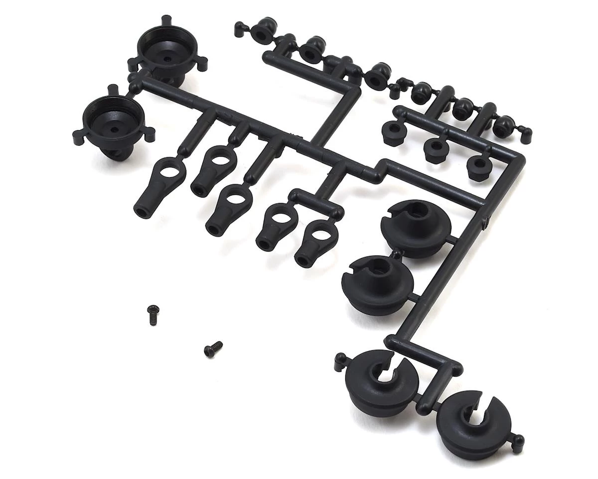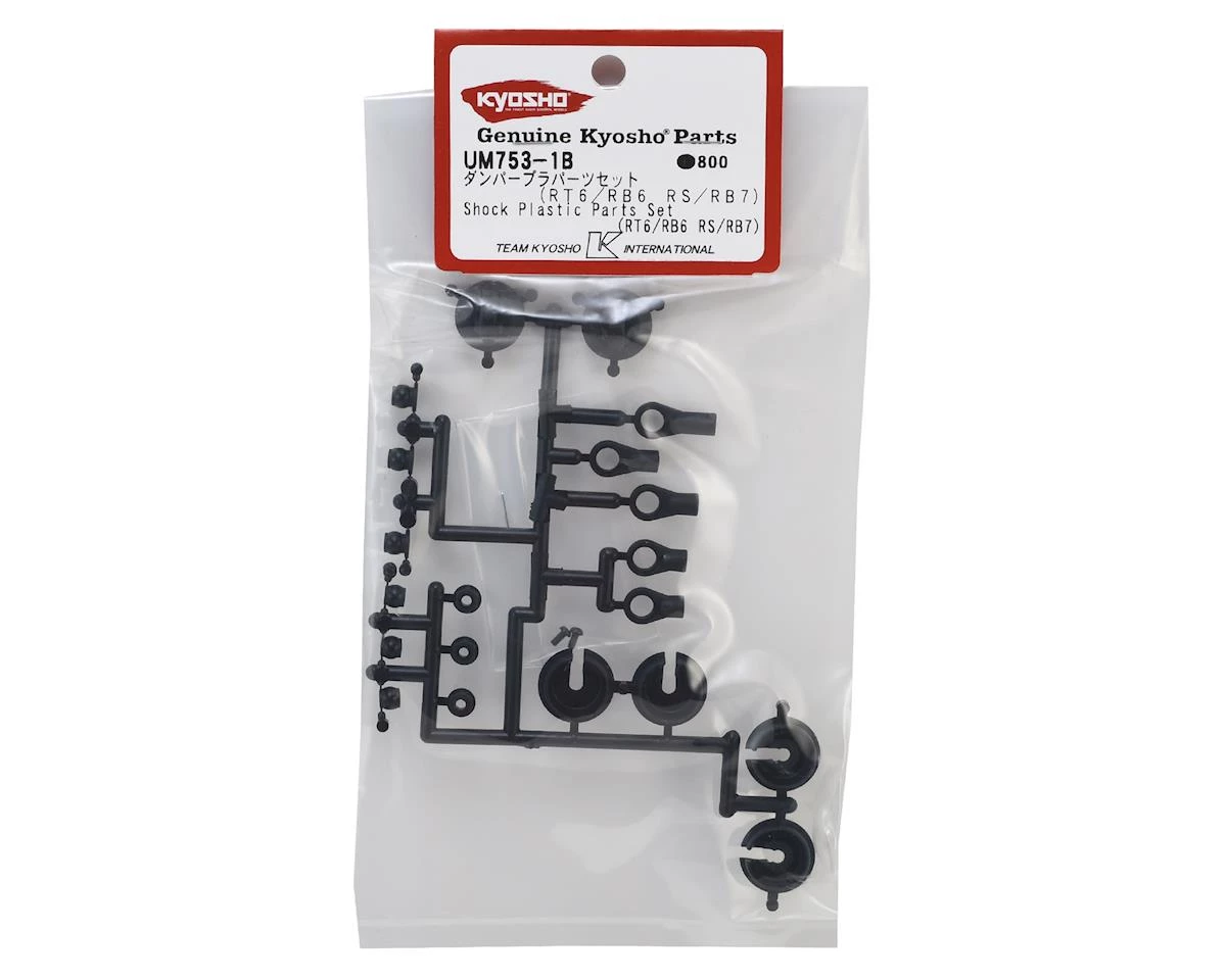 Kyosho RB7 Shock Plastic Parts Set. Package includes replacement shock caps, spring cups, rod ends and cap bushings.