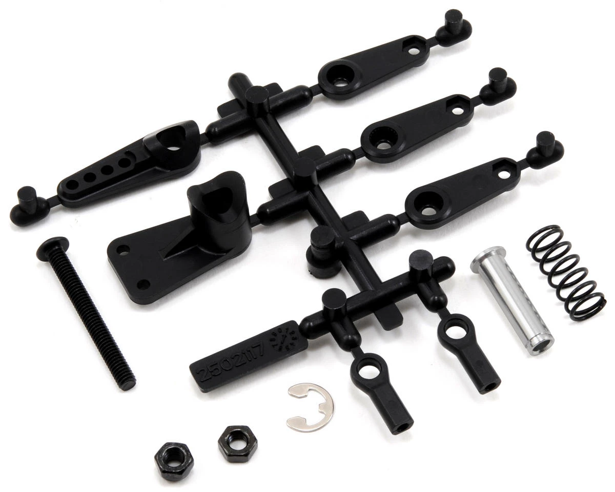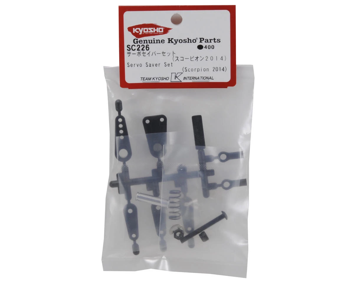 This is a replacement Kyosho Scorpion 2014 Servo Saver Set. Package includes all the parts needed for the servo saver assembly, as well as hardware and servo horns.