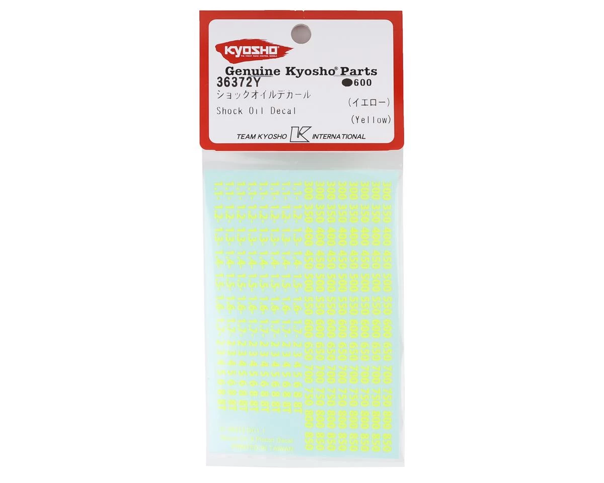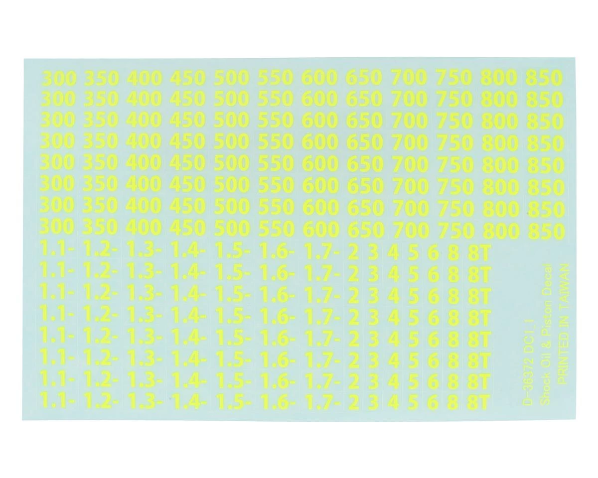 The Kyosho Shock Oil & Piston Decal Set makes it easy to remember what oil and piston you are running in your shocks. Includes yellow 300 through 850cst oil weight decals – eight each, as well as 1.1 to 1.7 with 2 through 8 decals for shock piston hole type identification – eight each.