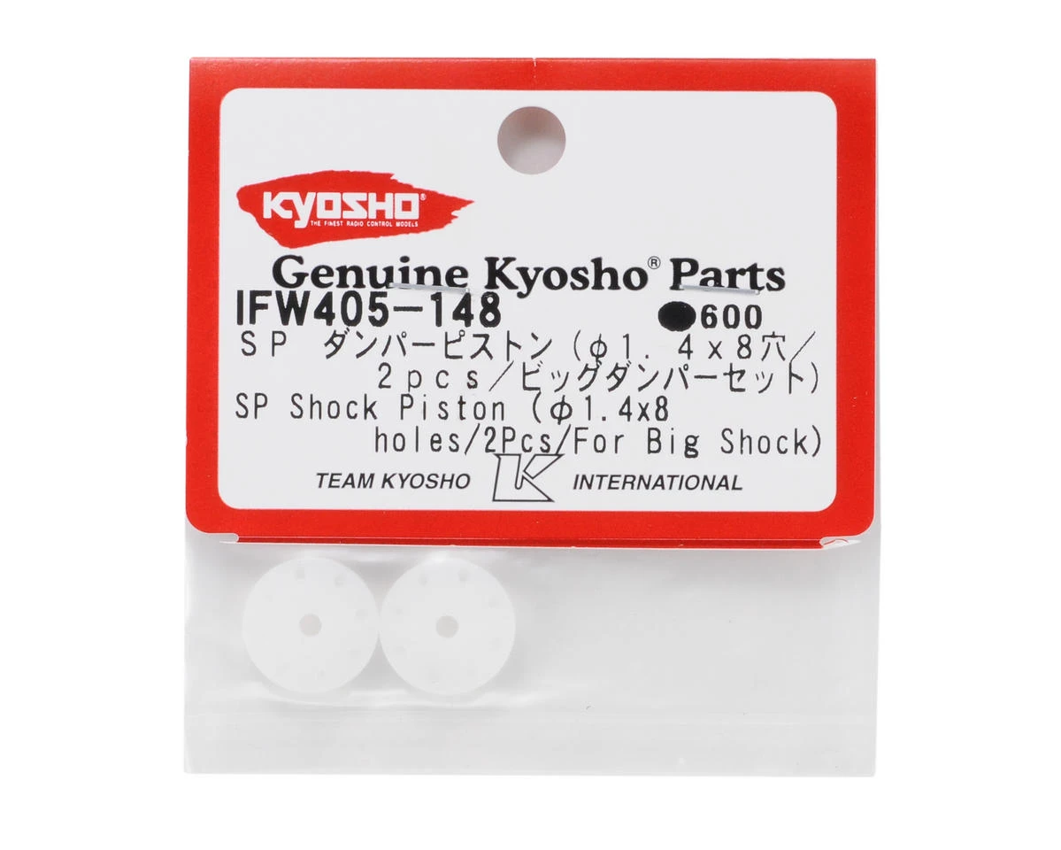 This is a pack of two optional Kyosho 1.4×8 SP Big Shock Pistons. These pistons feature eight angled 1.4 holes that help deliver smoother function during normal use but provide greater resistance on landings. Â