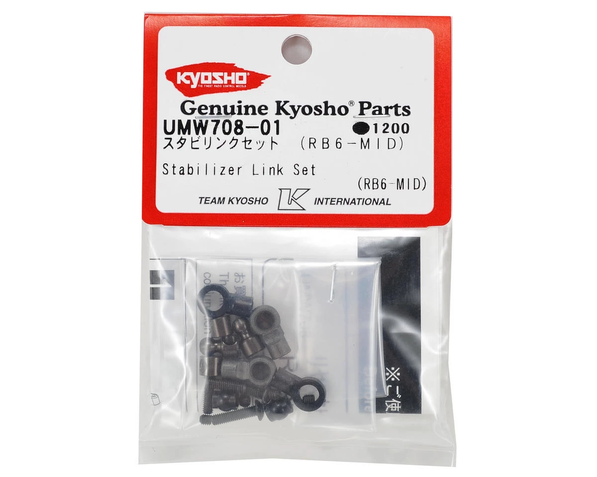 This is a replacement Kyosho “Mid Motor” Stabilizer Link Set, and is intended for use with the Kyosho RB6 equipped with the optional Kyosho Mid Motor Rear Stabilizer Set (KYOUMW708). Package includes all the linkage components included in the rear stabilizer set.