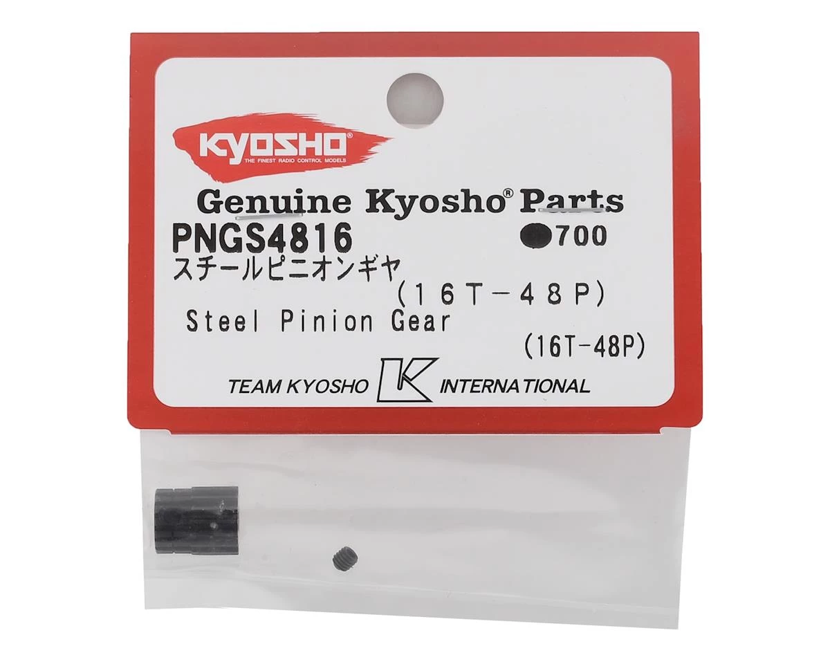Kyosho 48 Pitch Steel Pinion Gear. These gears are available in a variety of tooth count options to fine tune torque and top speed. Package includes one gear and one set screw.