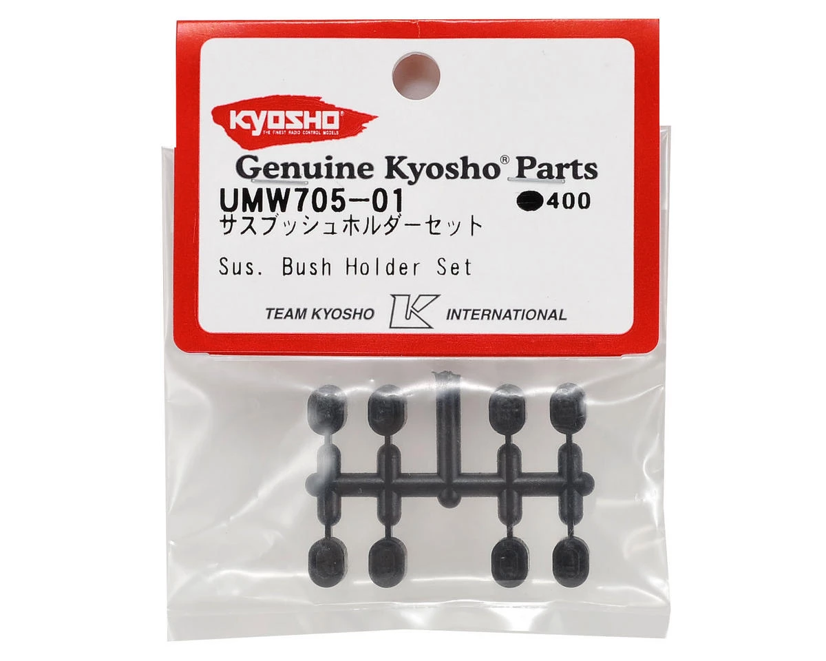 This is a replacement Kyosho Suspension Holder Bushing Set, and is intended for use with the Kyosho RB6 equipped with the optional Kyosho Aluminum Rear Suspension Holder (KYOUM706, KYOUM707). Package includes two A bushings, two B bushings, two C bushings, and two D bushings.