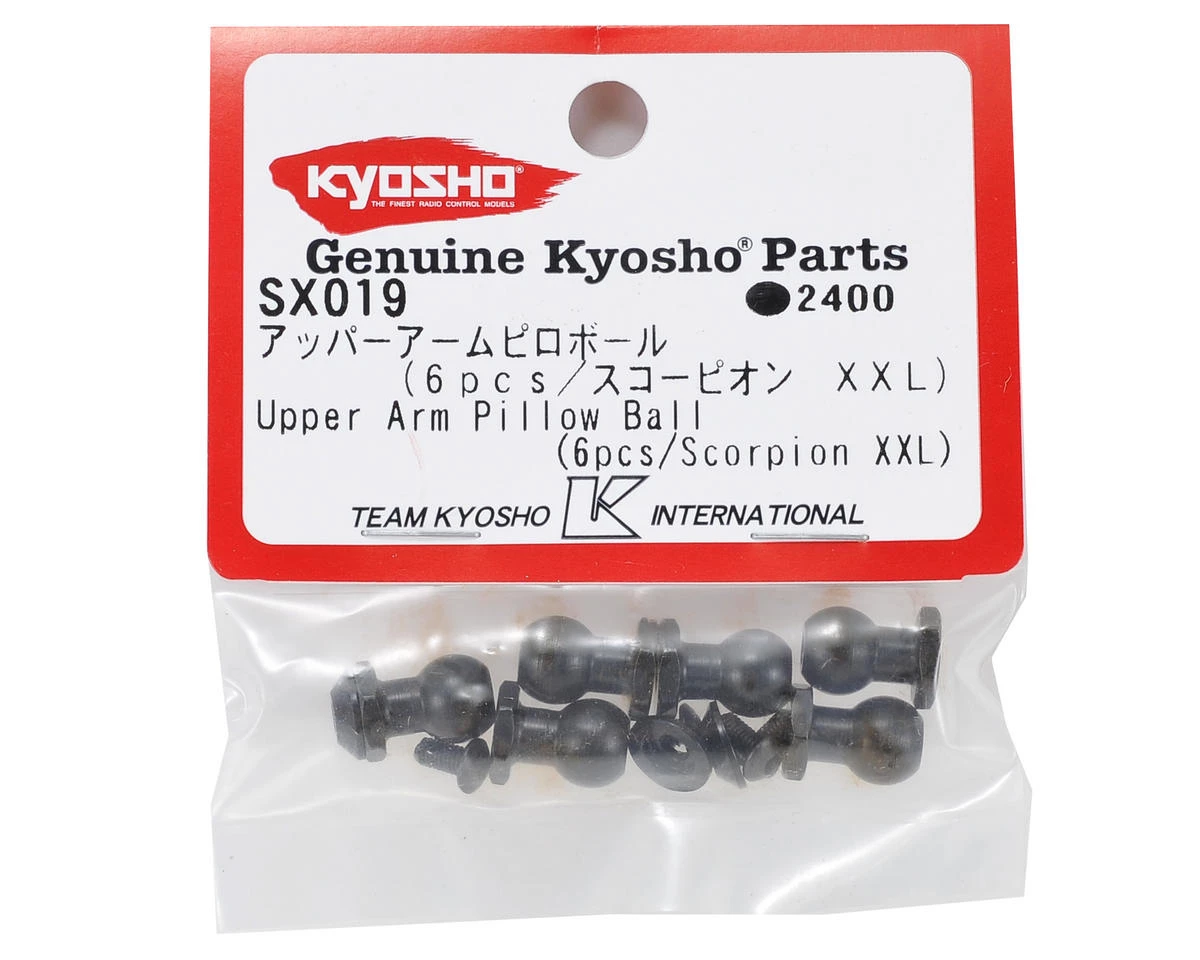 This is a pack of six replacement Kyosho Upper Arm Pillow Balls, and are intended for use with the Kyosho Scorpion XXL VE 1/7 scale buggy. This package also includes four screws and four washers.