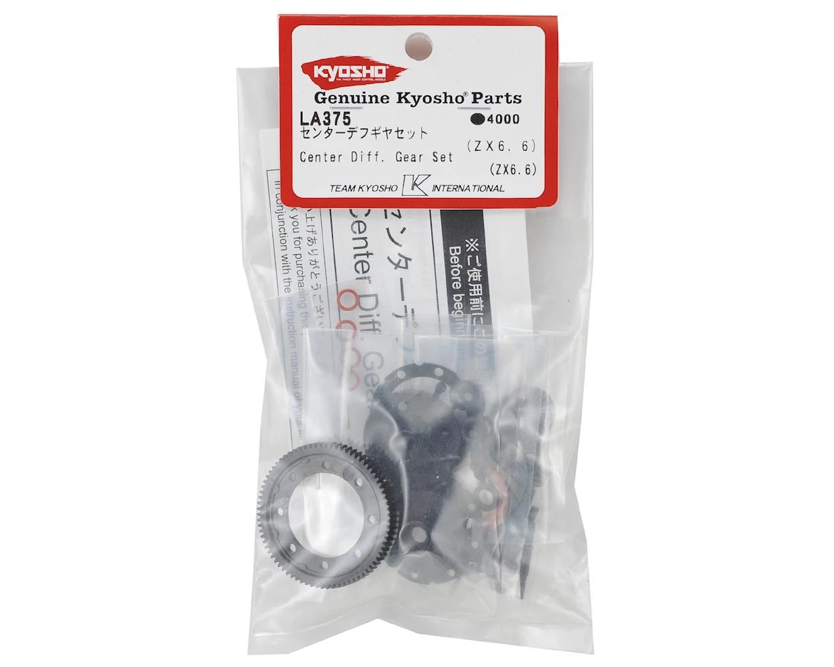 Kyosho ZX6.6 Center Differential Set. This package includes all the parts needed to build one complete center differential for the Lazer ZX6.6. This can be used with the standard ZX6, but additional parts are required for installation. KYOLA359B, KYOLA376 and KYOLA378. OR 2x KYOLA377, 2x KYOLA379, with 1 – KYOLA376 and 1 – KYOLA378 for forward mounted motor – OR – 2 – KYOLA377 for rear mounted motor.